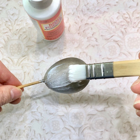 Once the paint is dry, completely cover the egg with Mod Podge, or slightly thinned white glue with a paint brush. Give it a good even coating. Make sure to cover all over the egg.