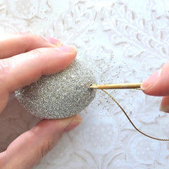 Take the dry, glass glitter covered egg off the skewer and poke the knot into the hole, using the skewer. Apply 3-in-1 Craft glue to the hole and cord.