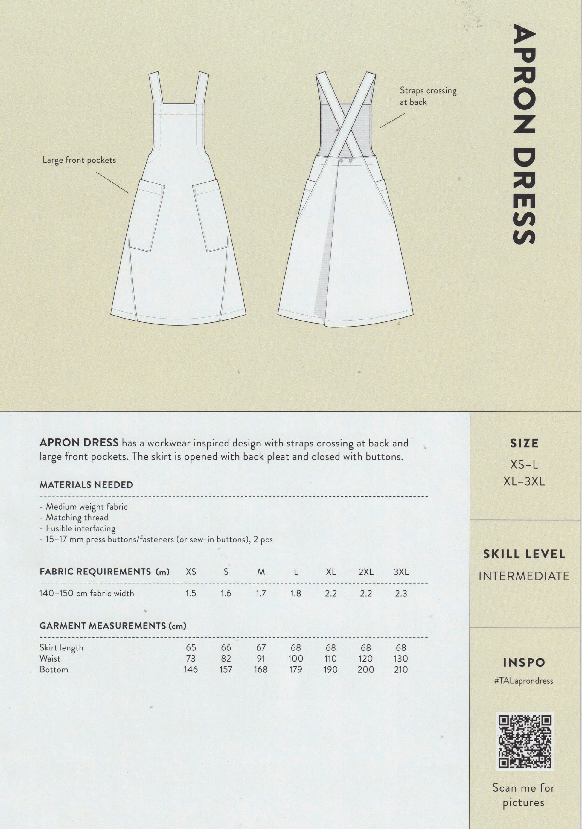 The Apron dress is one of those dresses that has it all! With its pinafore workwear-inspired yet feminine design, straps crossing at back, the back pleat closed with buttons and the large front pockets make this dress both functional and attractive. Easy to make, easy to wear!