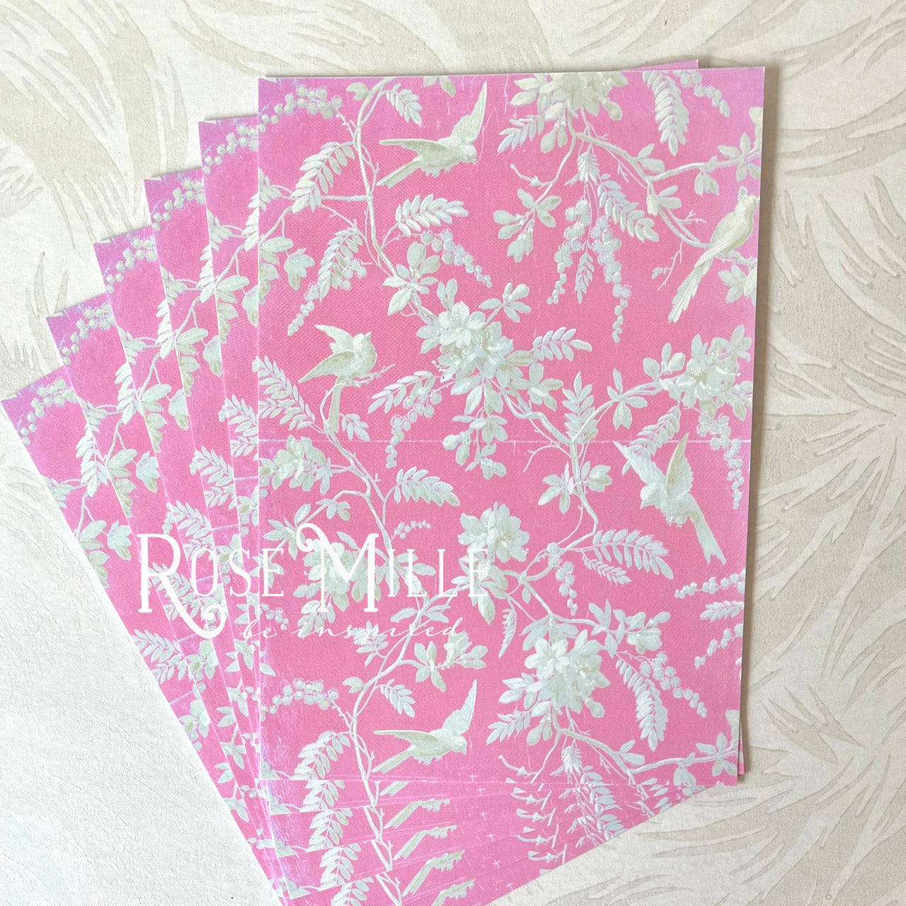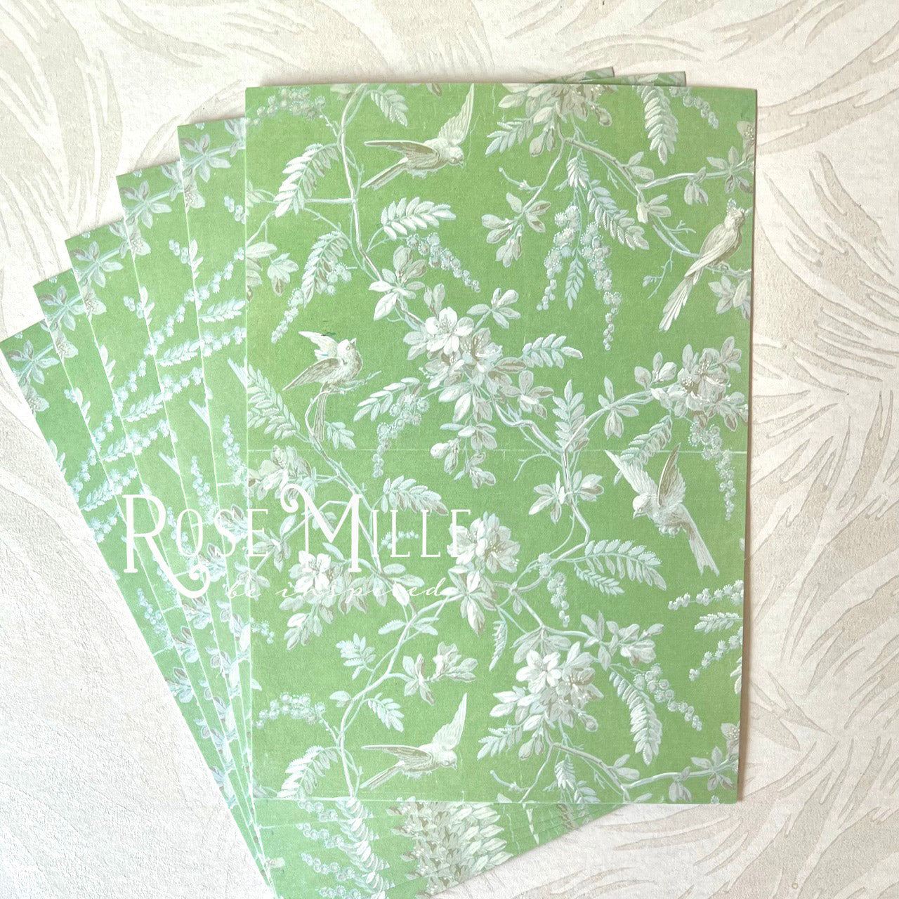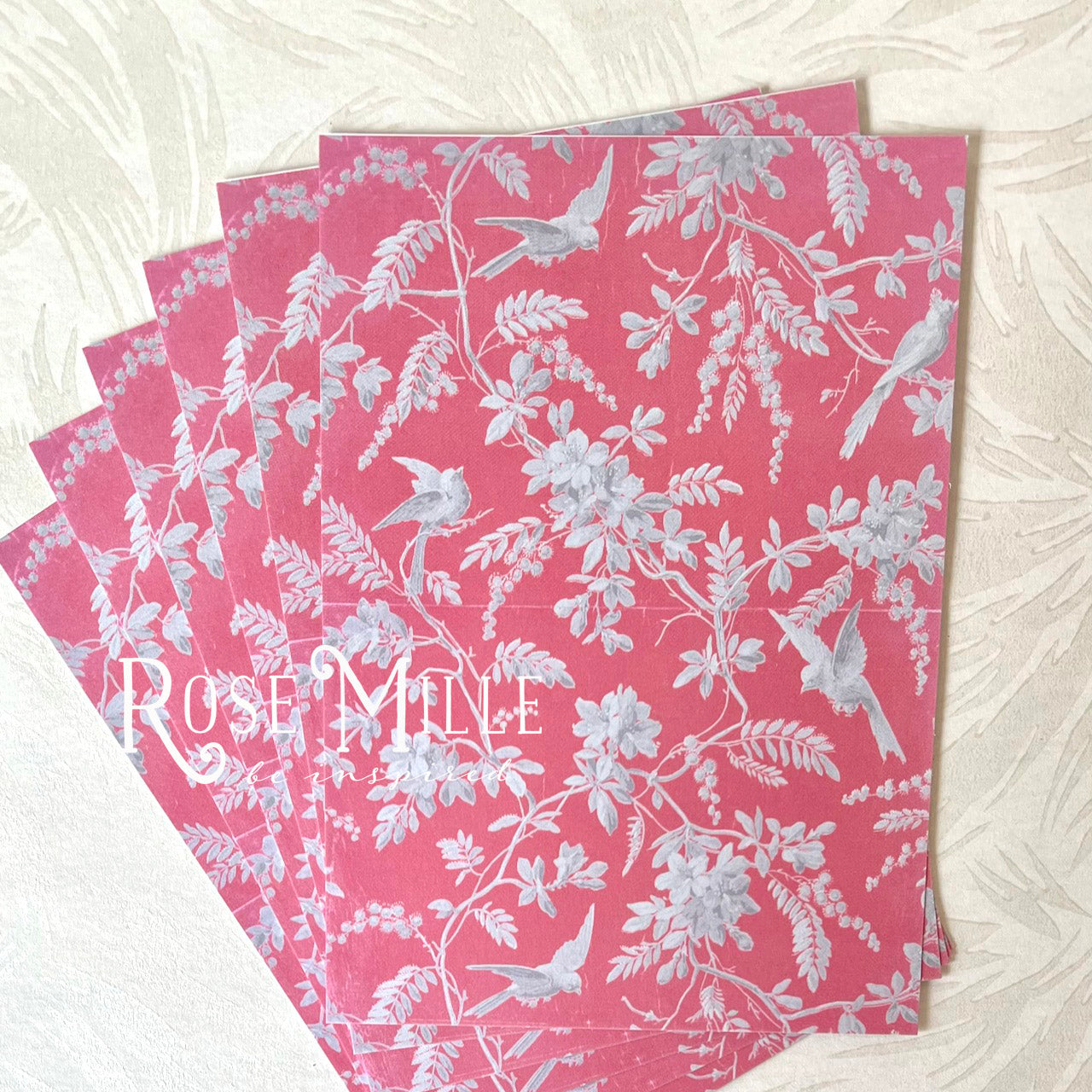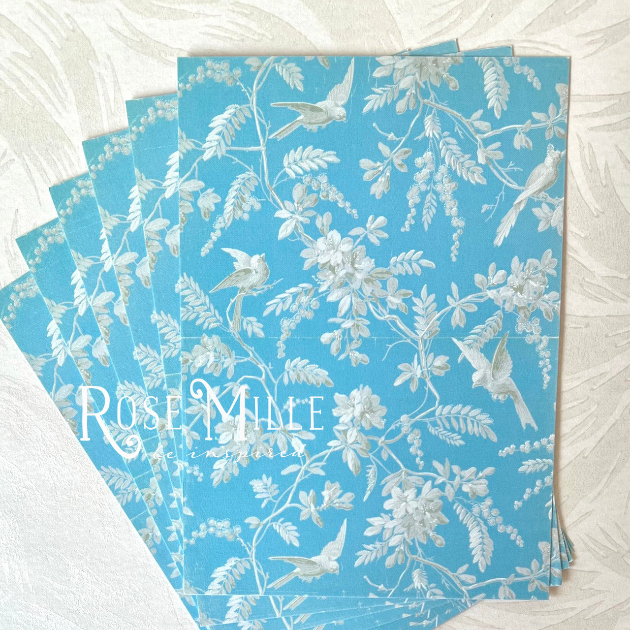 Single-sided 5" x 7" layering card with antique wallpaper image of white birds in flight on a color background. Use these cards to layer and decorate a beautiful creation.