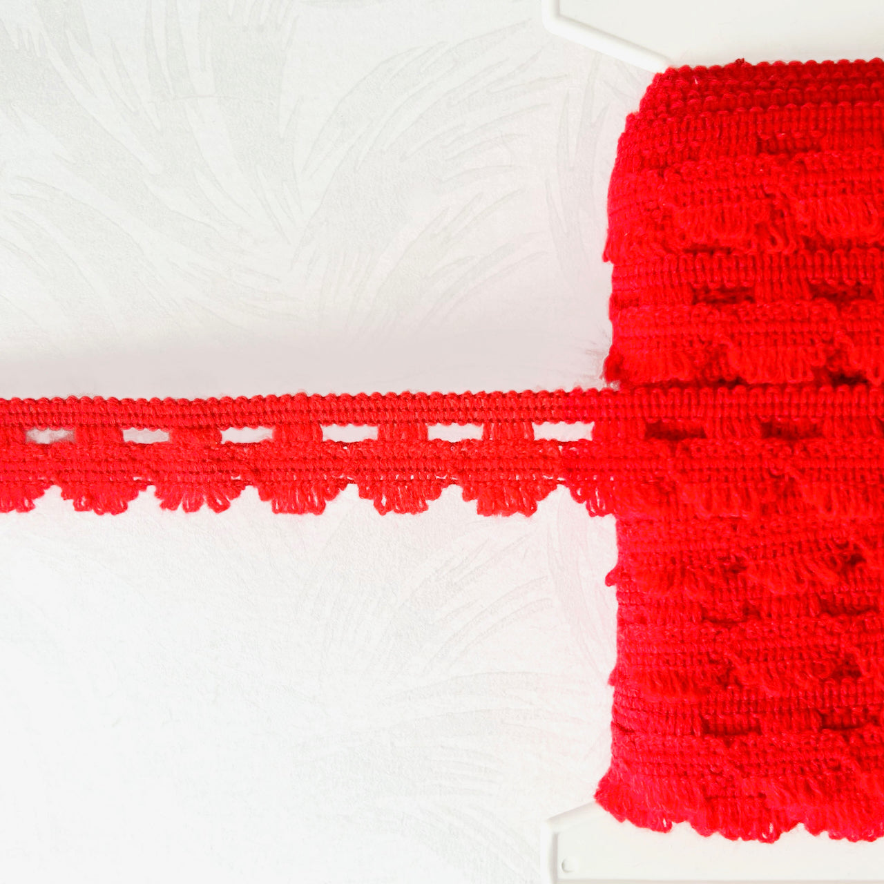Bright red wool like acrylic cluny lace.