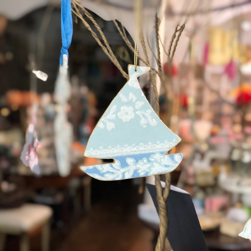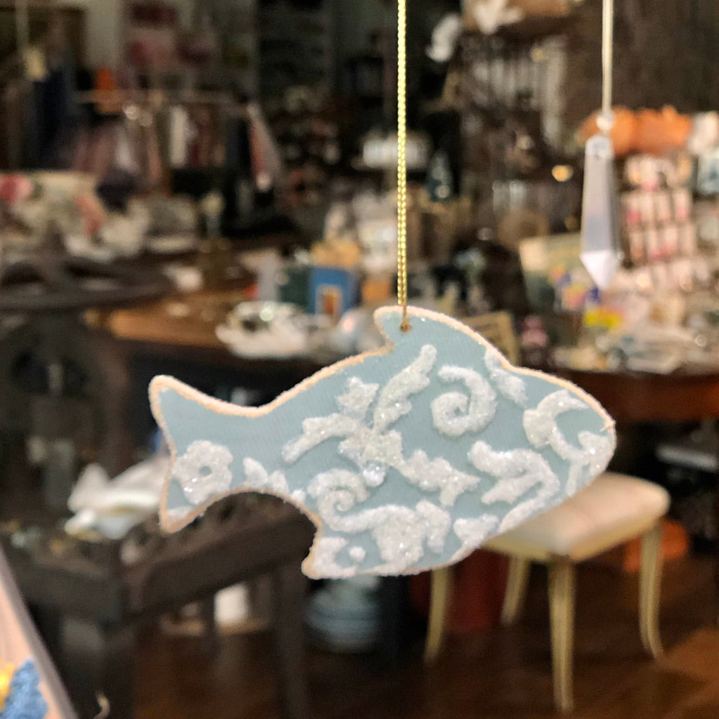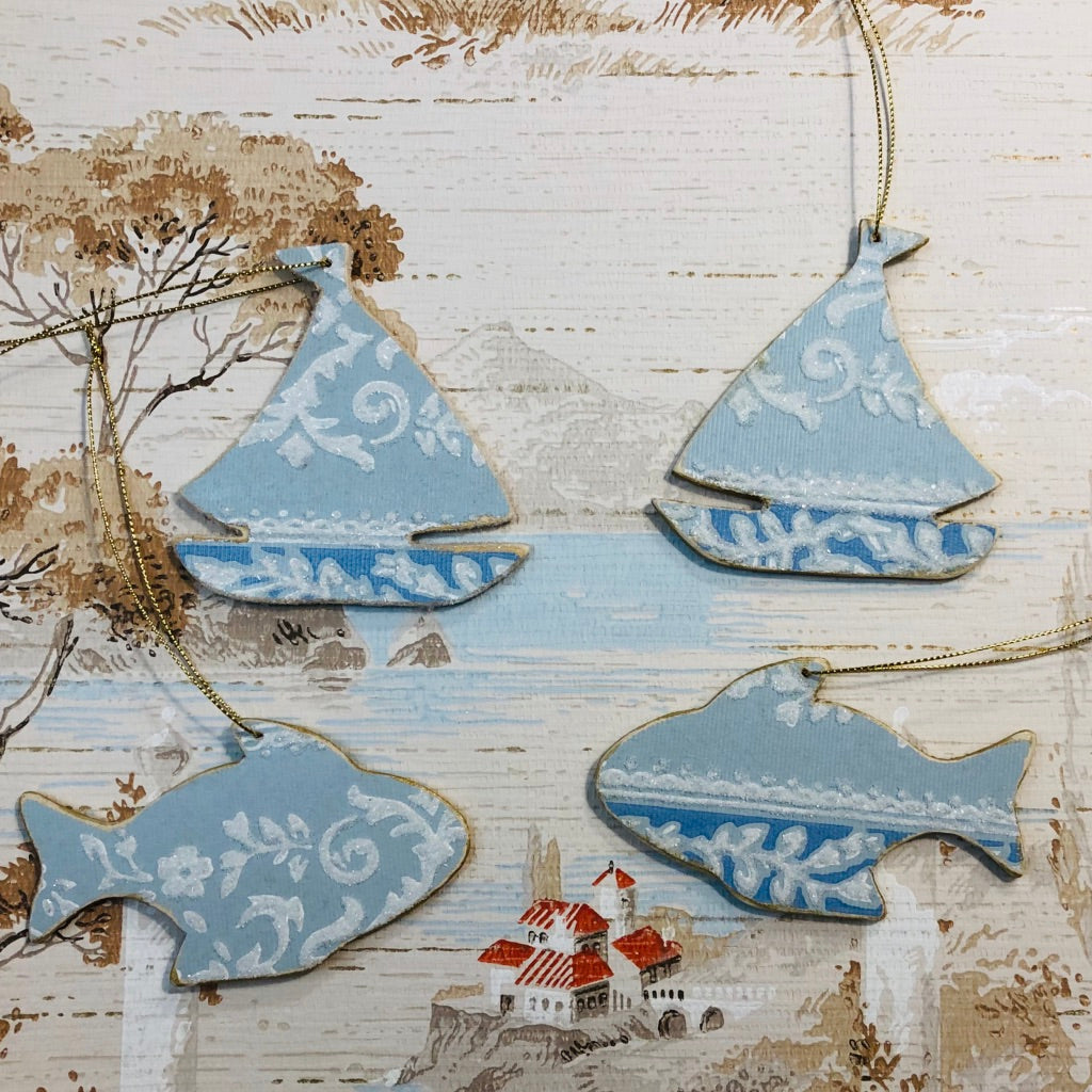 Adorable wooden sailboats and fish covered with vintage wallpaper and "sugared" with glass glitter. They have golden edges and are stung with a gold cord. Perfect as a gift topper, complete with tag to write a name or sentiment. Or use as an ornament any time of the year.
