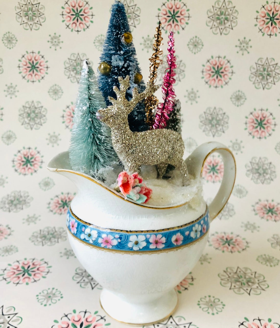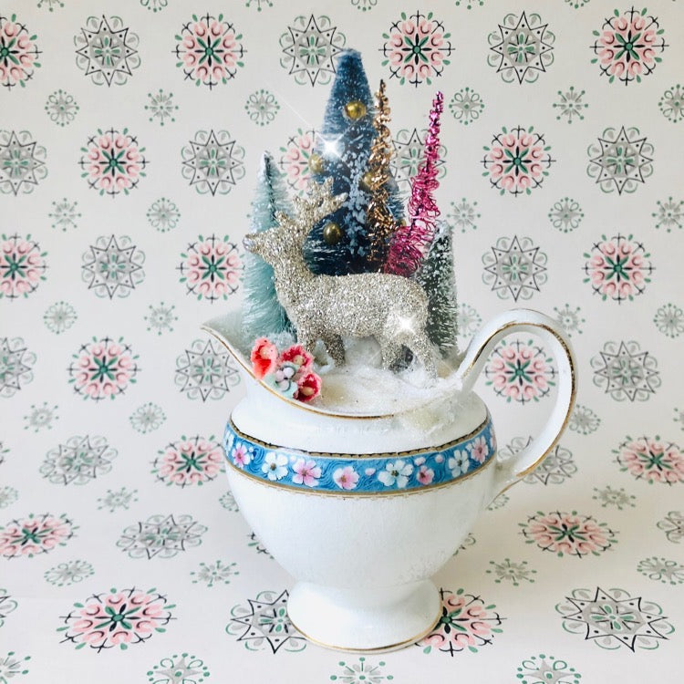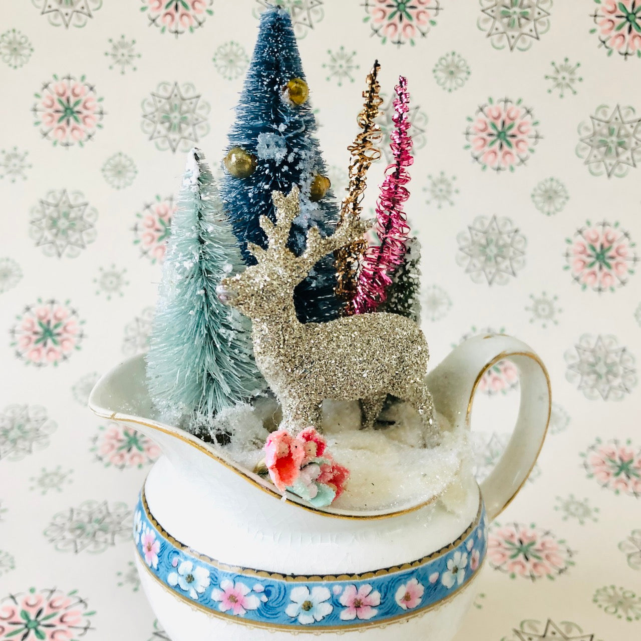 Vintage porcelain white with a stripe of flowers, creamer by J & G Meakin in England with a charming wintery scene featuring a sterling glass glittered deer, 3 bottle brush trees, a retro tinsel spray in gold and pink, and a bouquet of pink forget-me-nots all on top of glittery glass glittered snow.