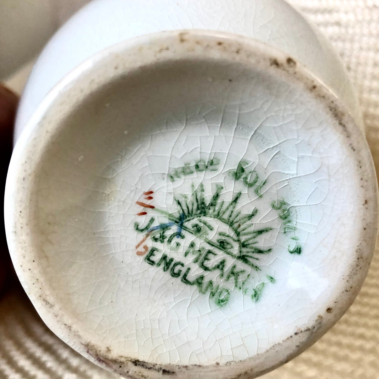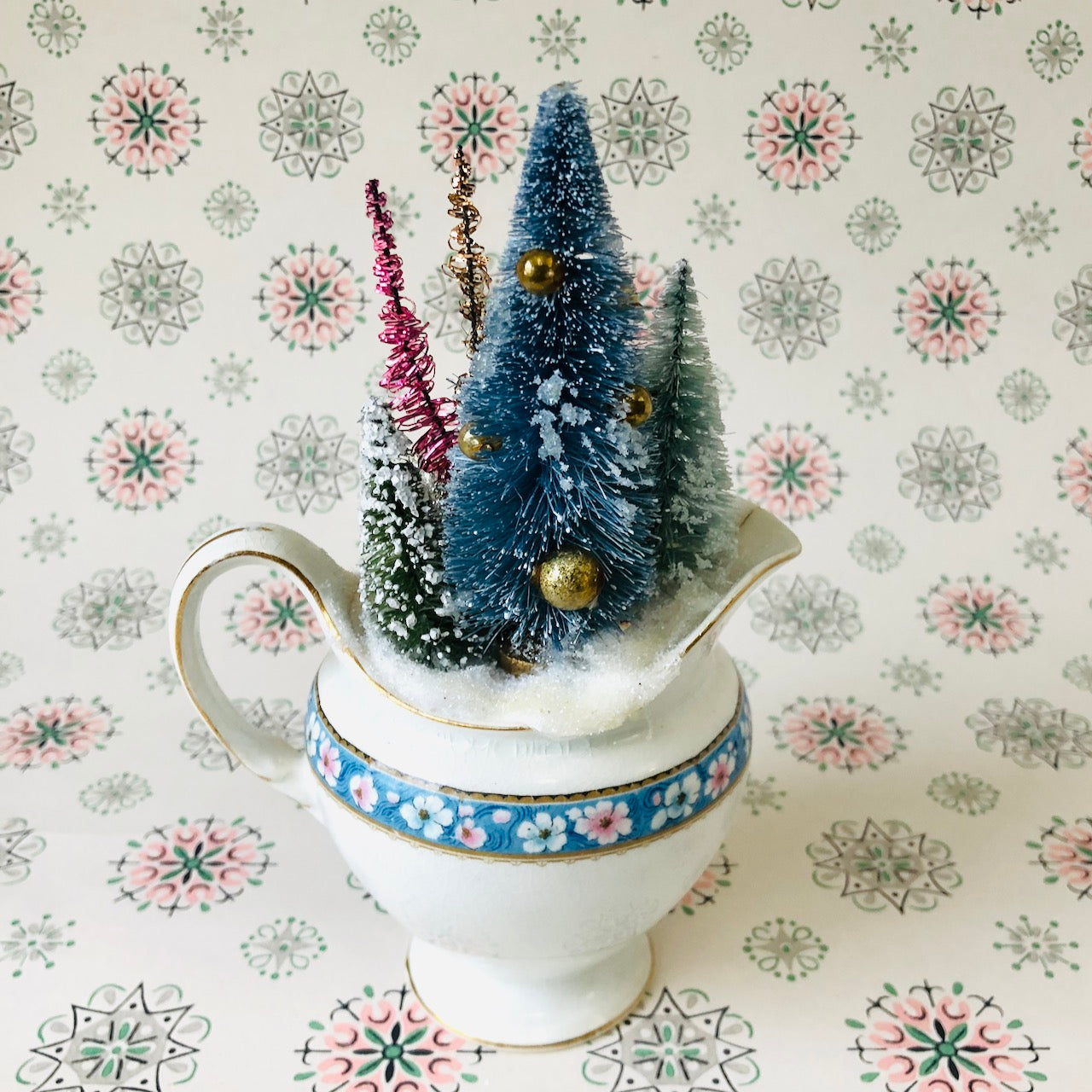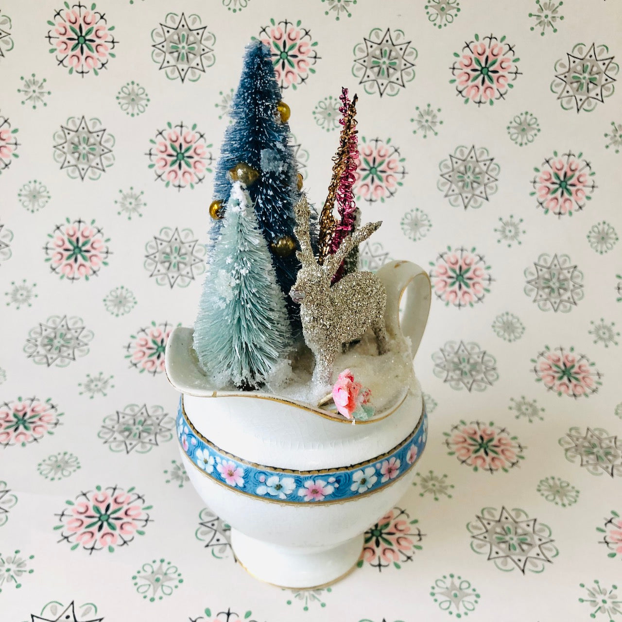 Vintage porcelain white with a stripe of flowers, creamer by J & G Meakin in England with a charming wintery scene featuring a sterling glass glittered deer, 3 bottle brush trees, a retro tinsel spray in gold and pink, and a bouquet of pink forget-me-nots all on top of glittery glass glittered snow.
