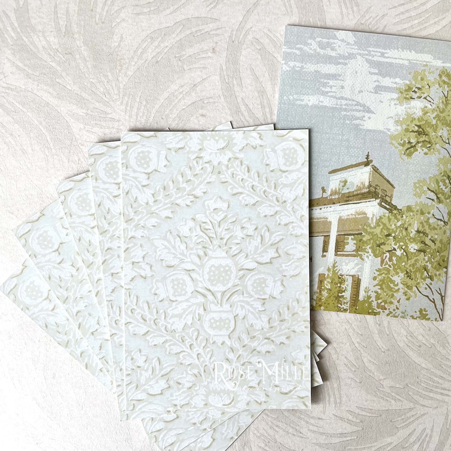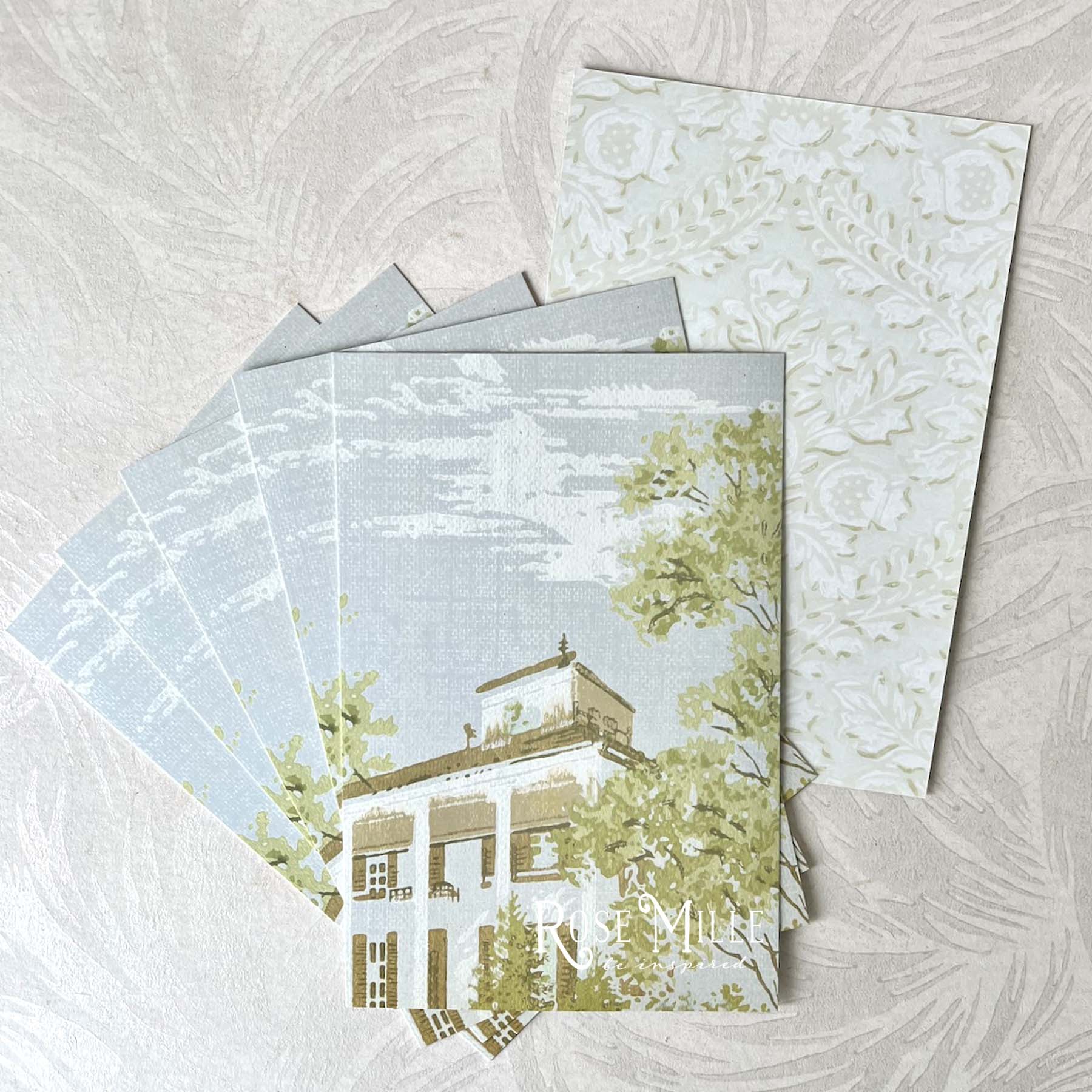 Vintage image cards with a chateau sky view on one side and robin's egg floral design on the other. Use these cards to layer and decorate.