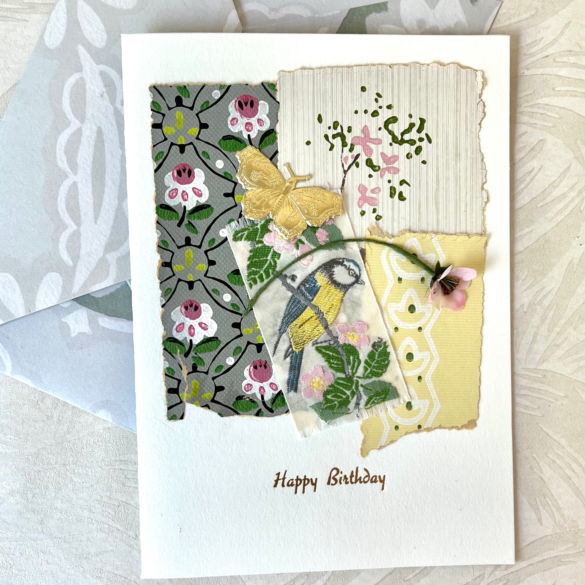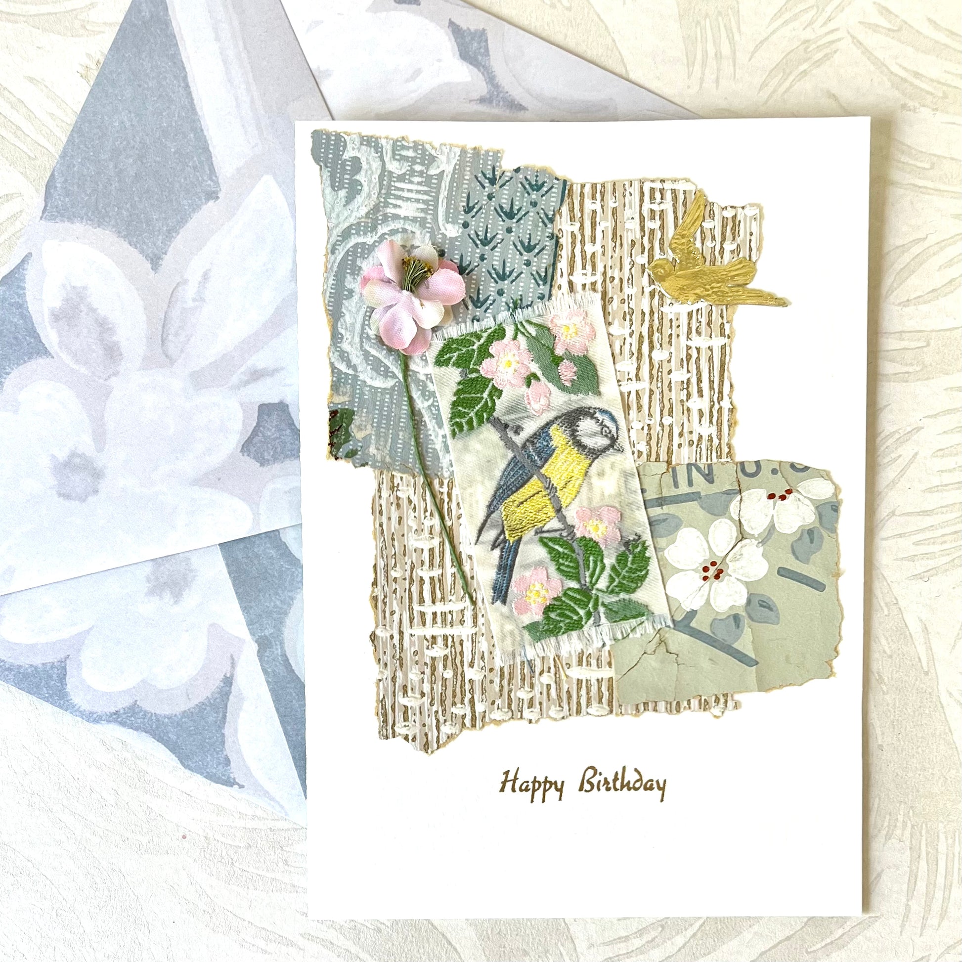 Collage Happy Birthday Embroidered Bird Card - Handmade