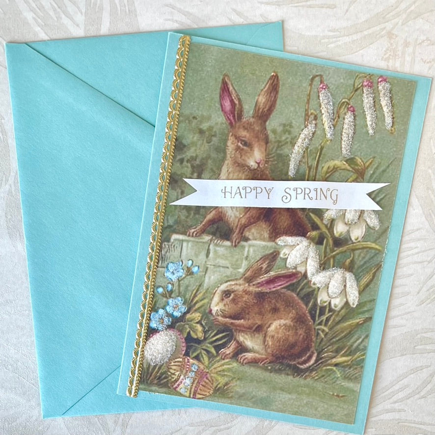Send a lovely A2 size aqua blue greeting card and matching envelope, featuring a vintage rabbit scene, flowers, and decorated Easter eggs.