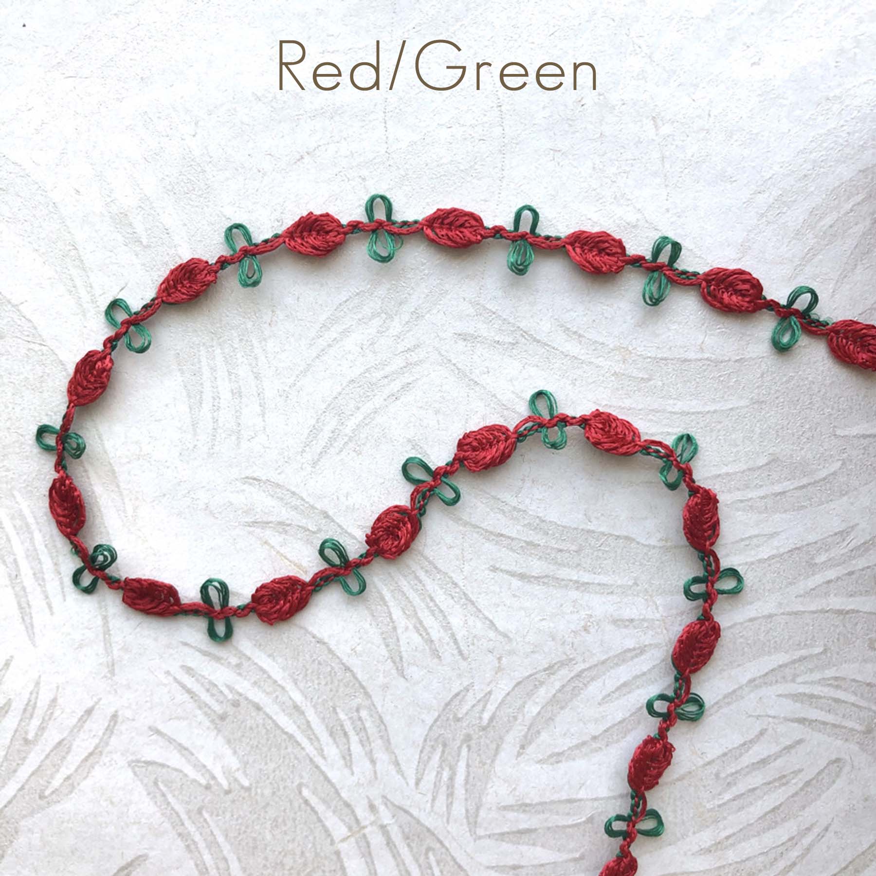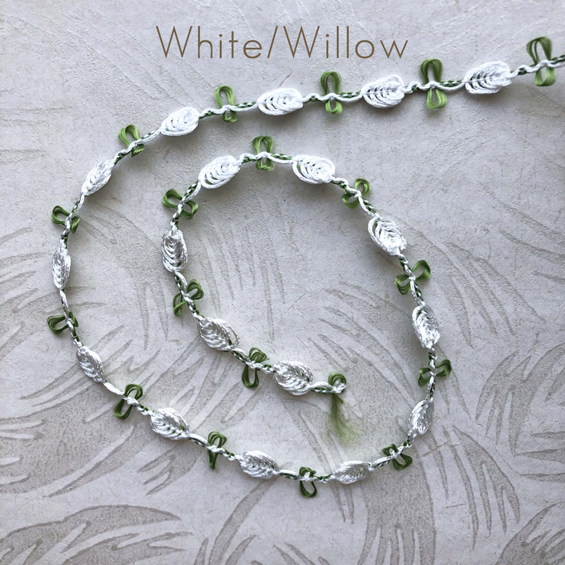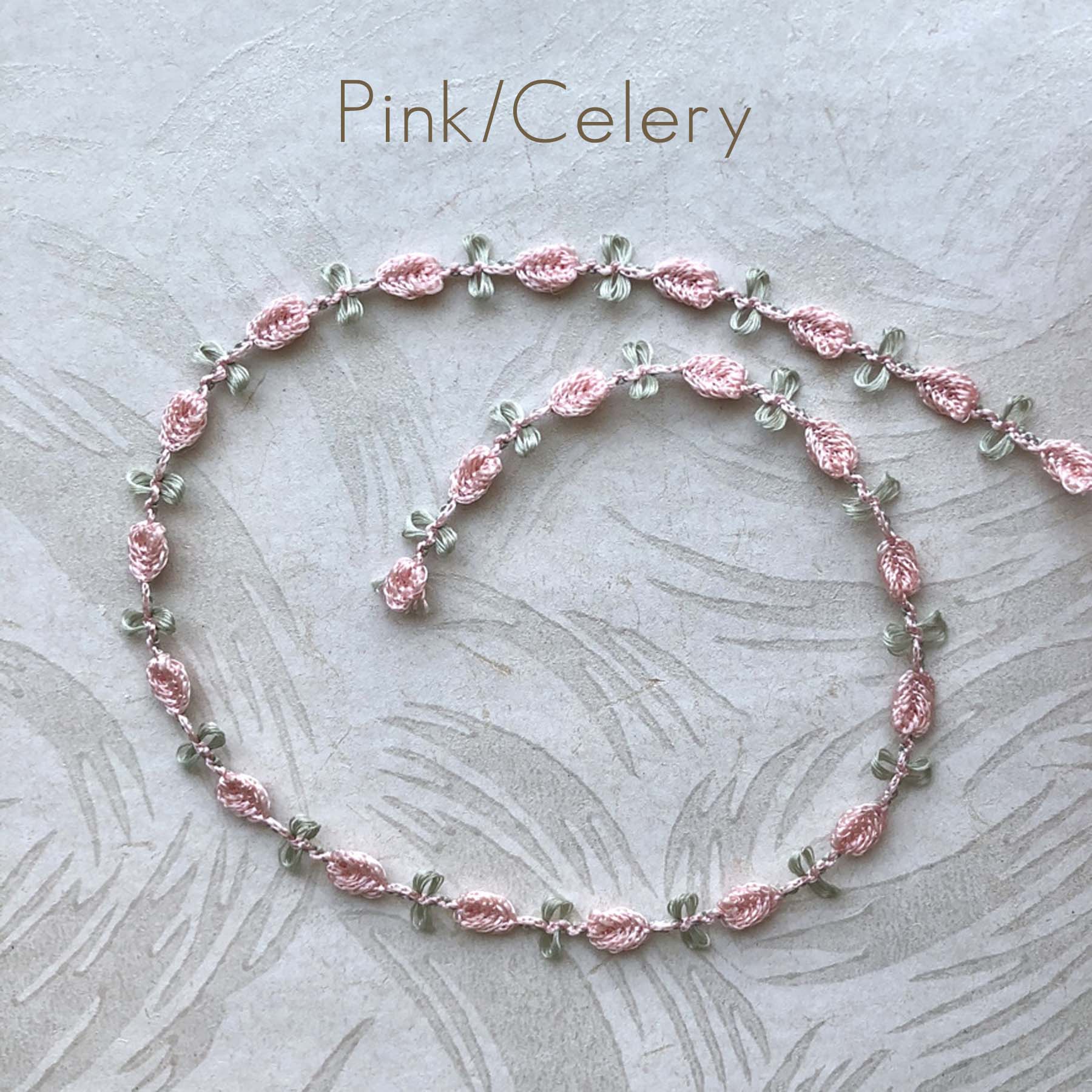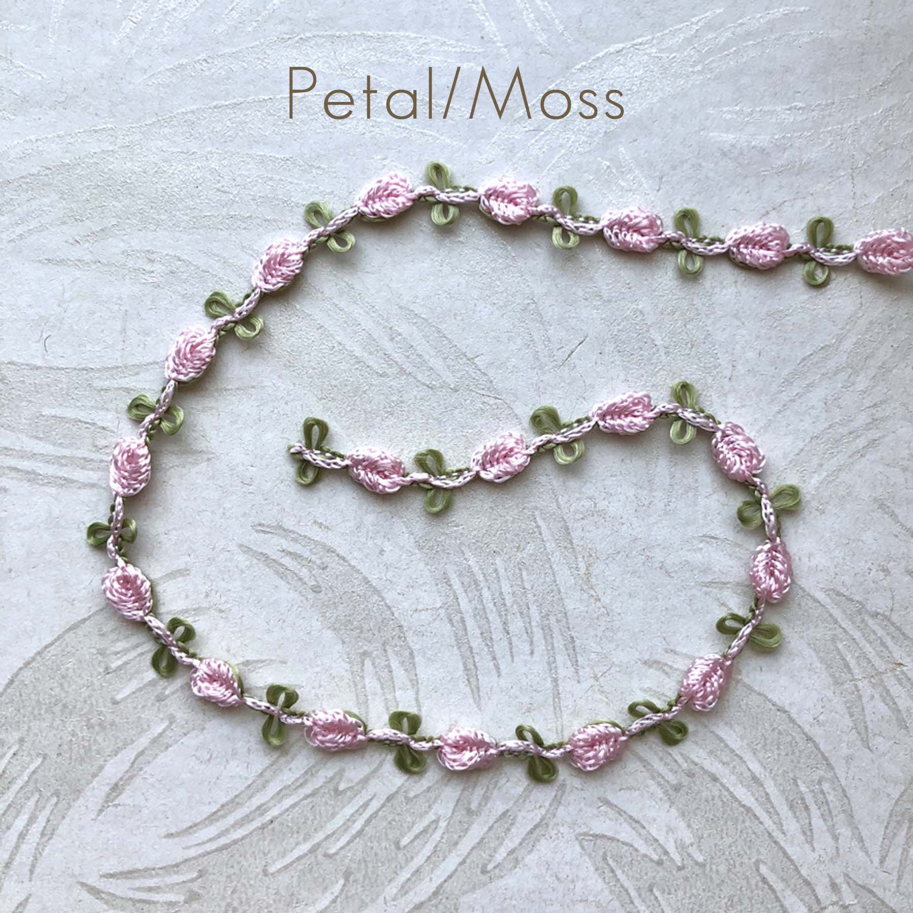 The perfect, delicate floral trim made from woven threads into the most delightful trim in so many color combinations. Wonderful for paper crafting, clothing, pillows, and so much more.