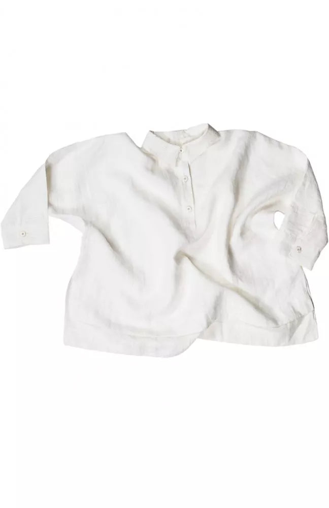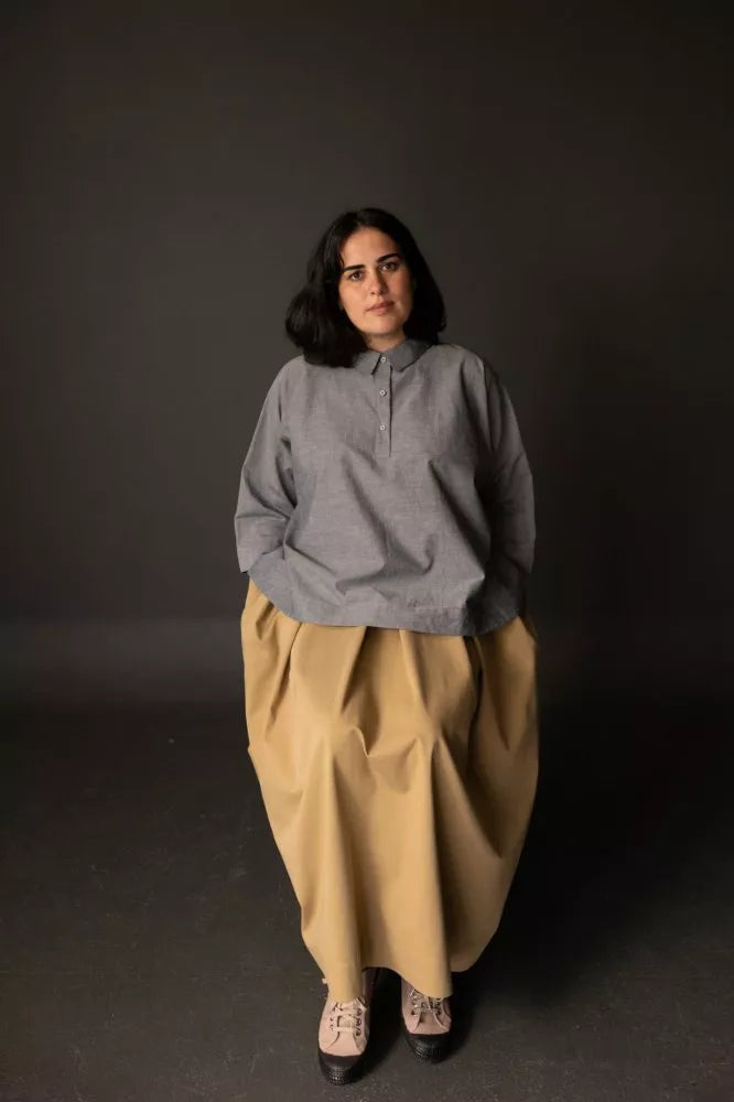 An oversized, boxy shirt with a dropped back hem and half placket. Swingy and absurdly comfortable.