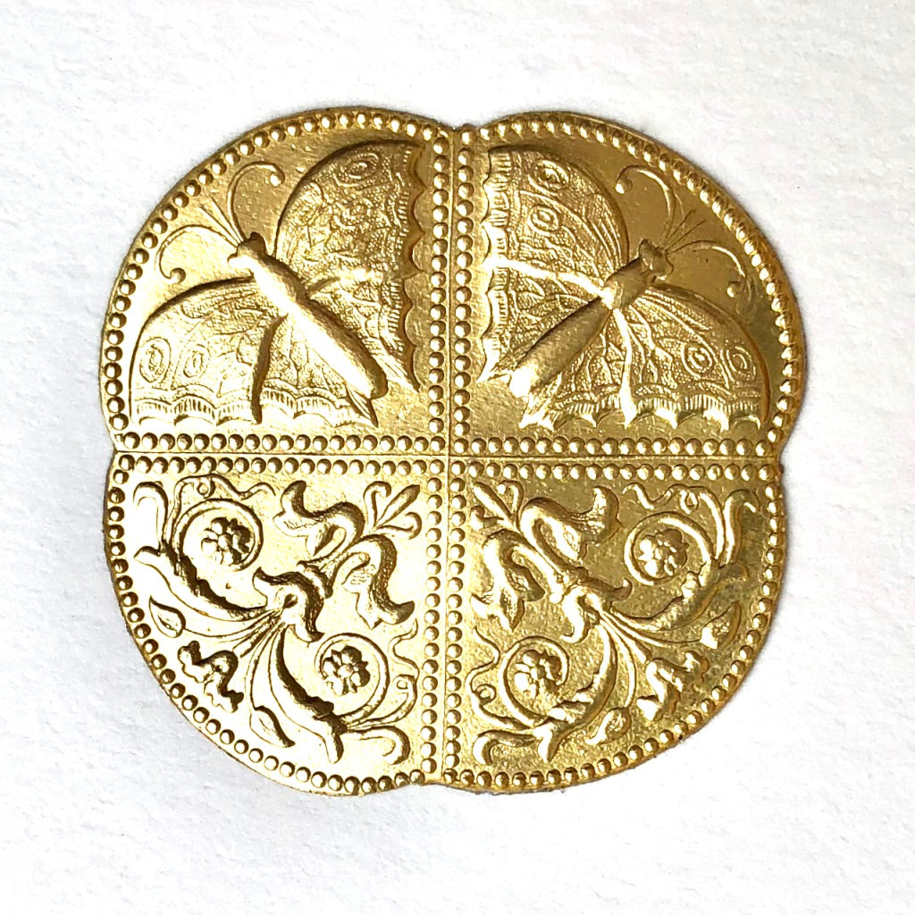 Made special for us, is this exquisitely detailed gold Dresden die-cut emblem made one at a time. The emblem is sturdy double sided (gold on both sides, but not double faced) pressed foil heavy paper. It has 4 sections; 2 with butterflies and 2 with a flourish design. Can be cut and used as corner decorations.