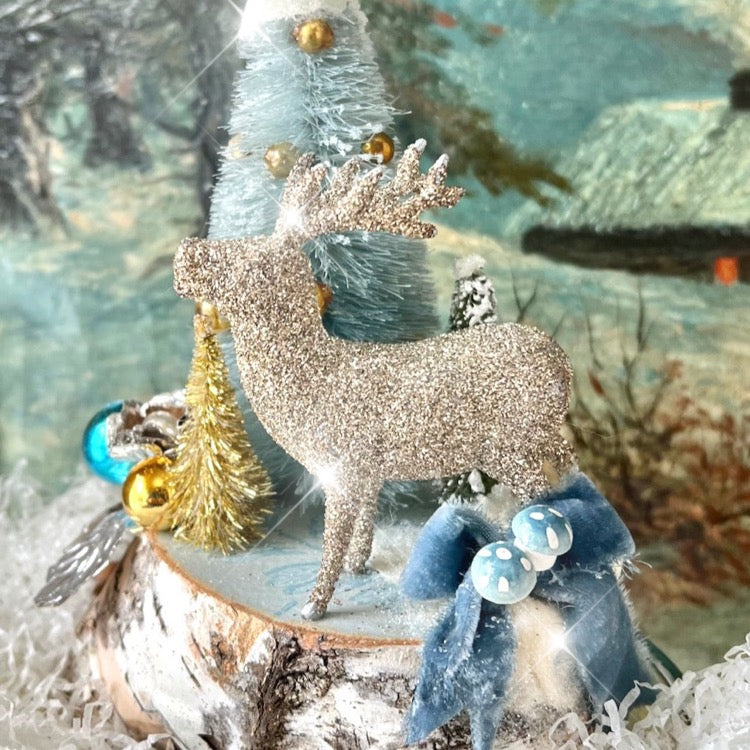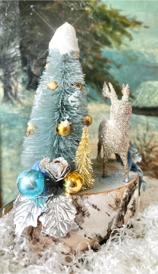 Retro blue baubles making a scene on a birch tree log. Fantastic silver glass glittered vintage deer is looking for it's mate. Hand dyed bottle brush tree decorated with vintage gold glass ornaments. There is a small bottle brush tree, mushrooms, and silk velvet ribbon. All sitting on a glass glittered snow covered real birch tree log.