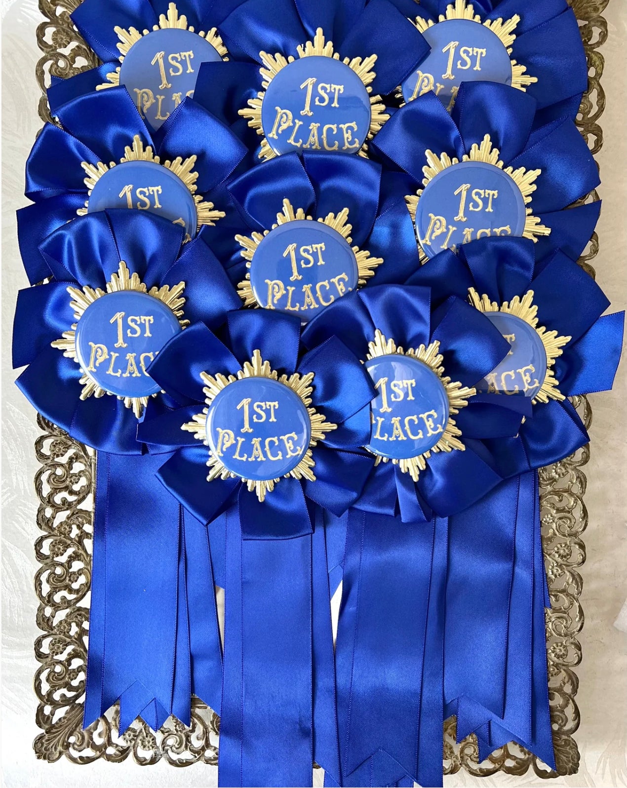 A fancy "First Place" center on Dresden die-cut medallion all placed on a beautiful vintage royal blue rosette bow with 4 ribbon tails. Pin at the back. Wear it proudly. Perfect for Father's day, graduation day, prize at any competition.