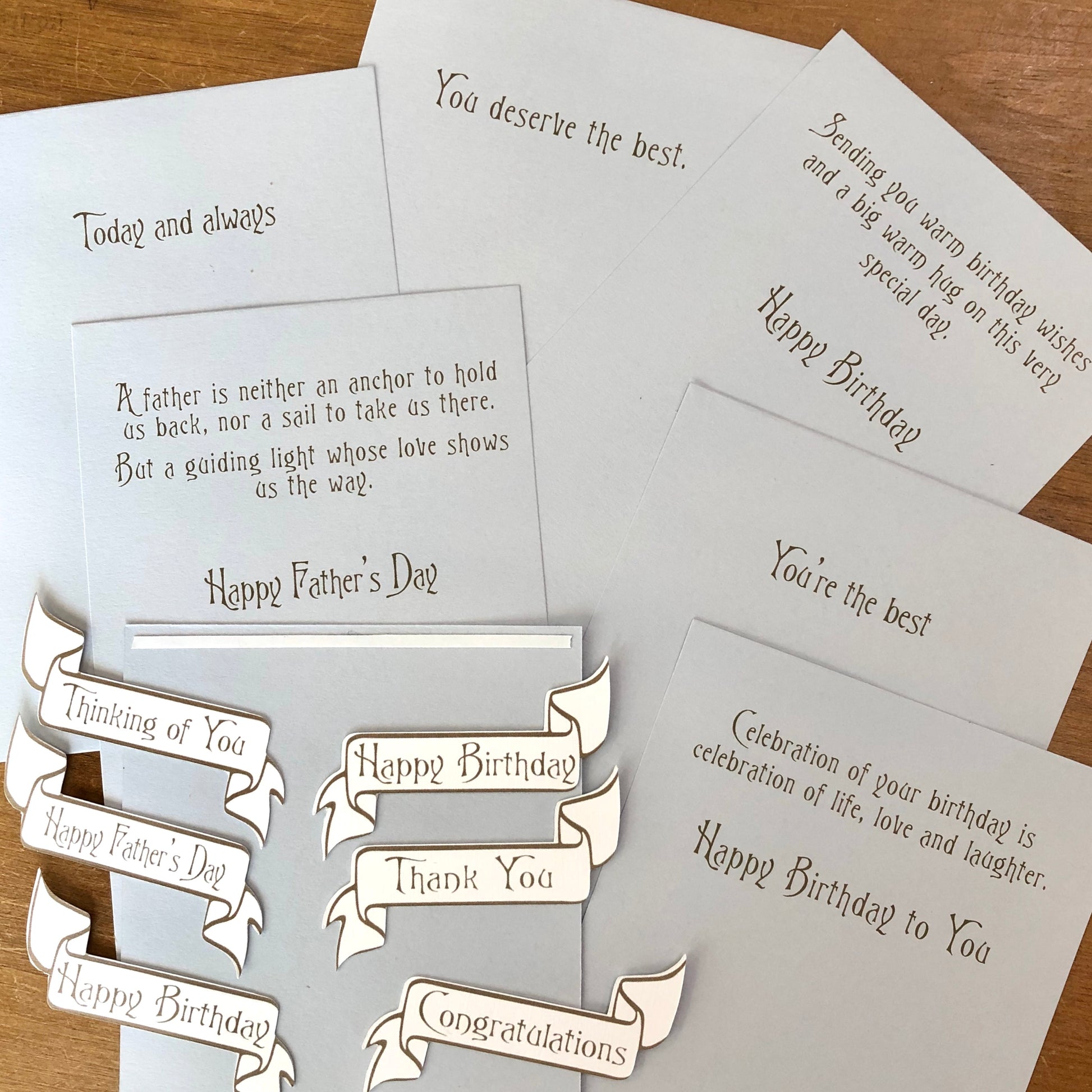 Greeting and sentiment messages for Birthdays (2), Fathers Day, Thank you's and Congratulations.