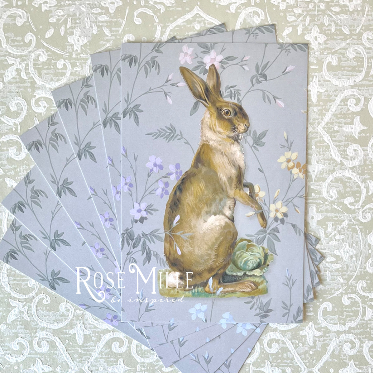 Vintage image post-card of a beautiful rabbit on a floral background. a "Post Card" image on the back. Use these cards to layer and decorate a greeting card, or just send as is.