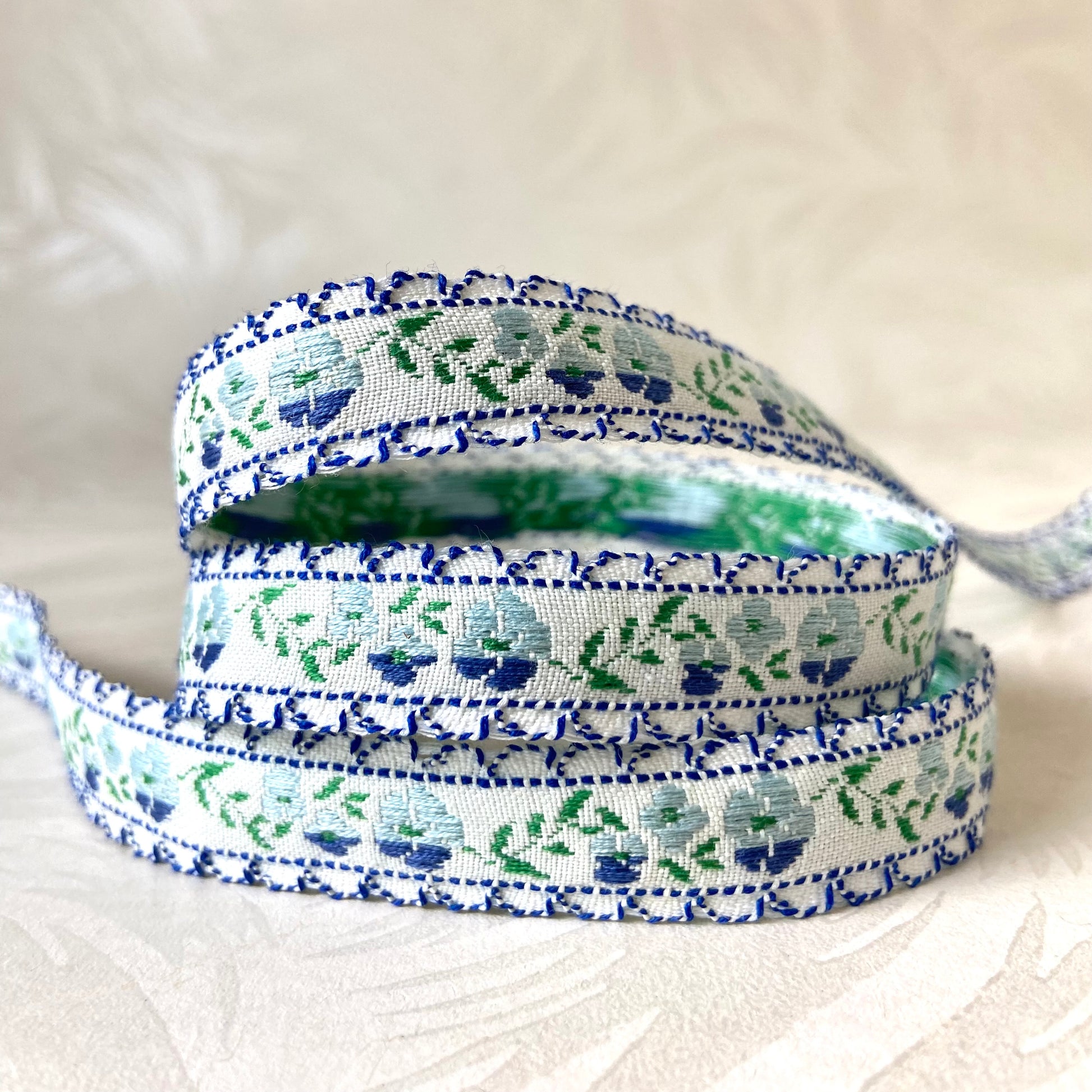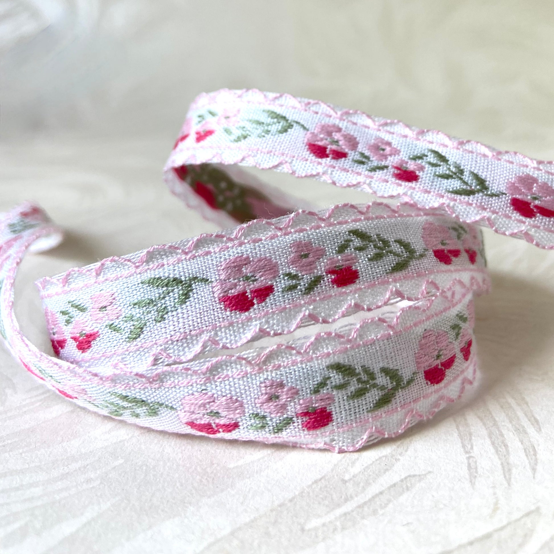 Jacquard trim with a floral vine pattern and scalloped edges. Made in Japan.