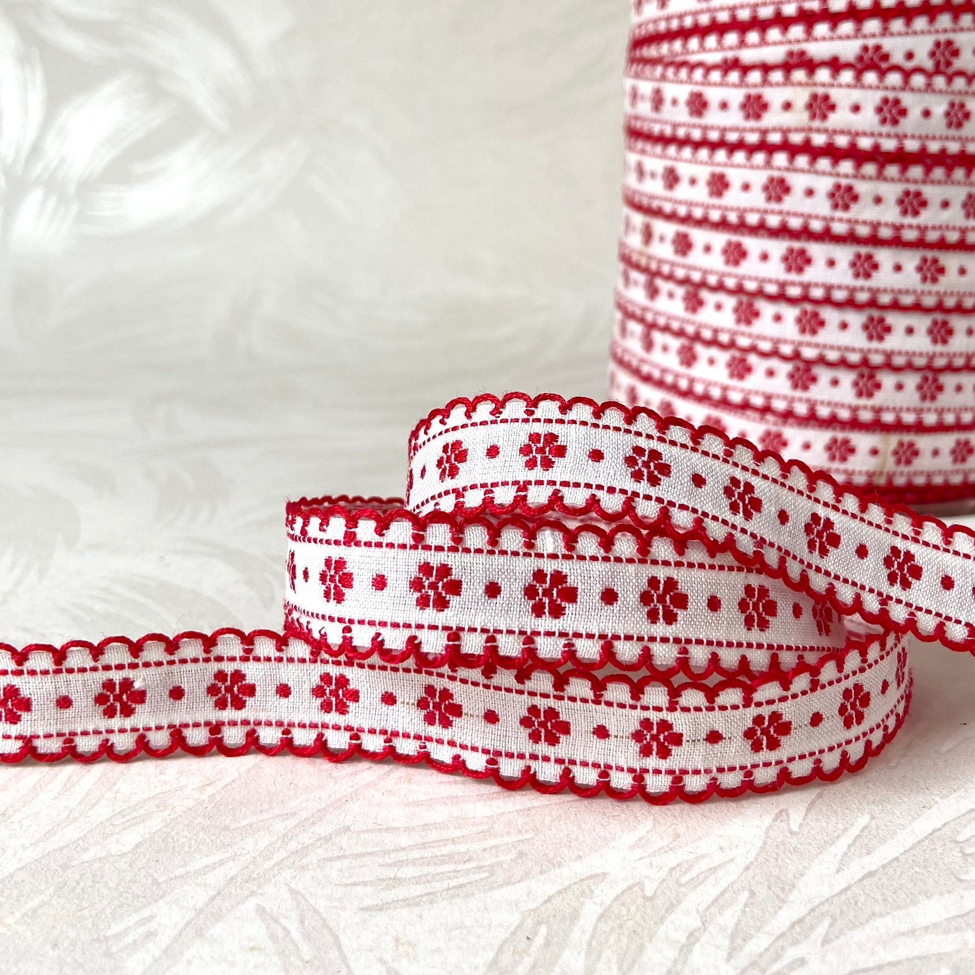 Cotton Jacquard with alternating pattern of red flowers and dots on a natural background with a scalloped red thread edge.