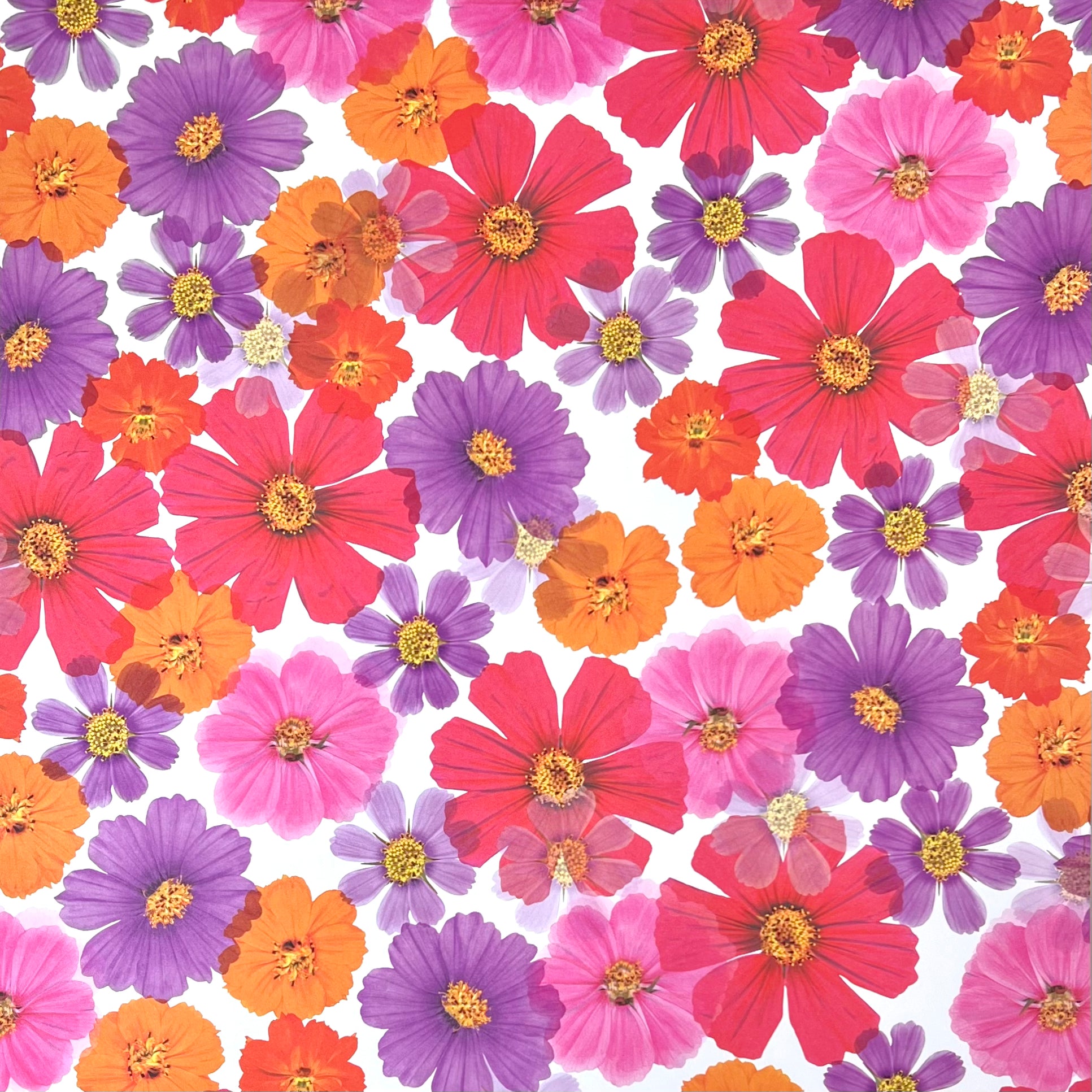 Photographs of real flowers layered over a white background. Wonderful pops of Red, Purple, Pink and Orange. Imagine the fun projects; card making, scrapbook pages, ornaments, that you can make with this joyful design.