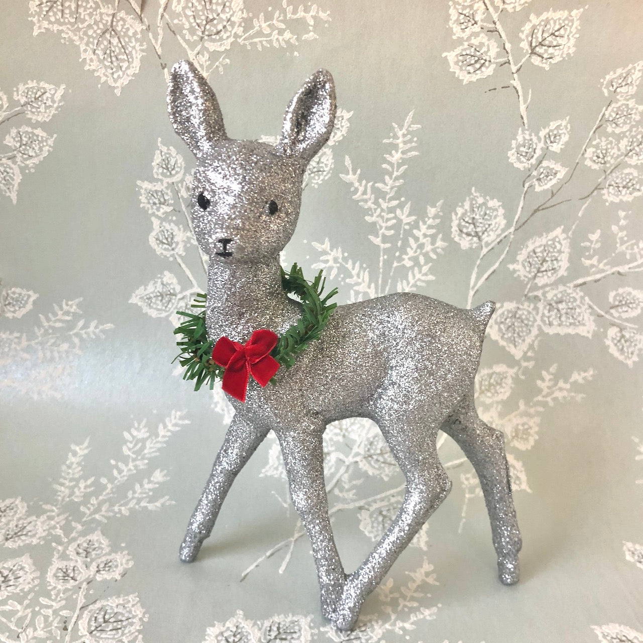 Large silver glittered retro style deer figurine with a festive wreath adorned with a tiny red velvet bow. Perfect for a mantle, tabletop, or any holiday grouping. And the price is amazing.