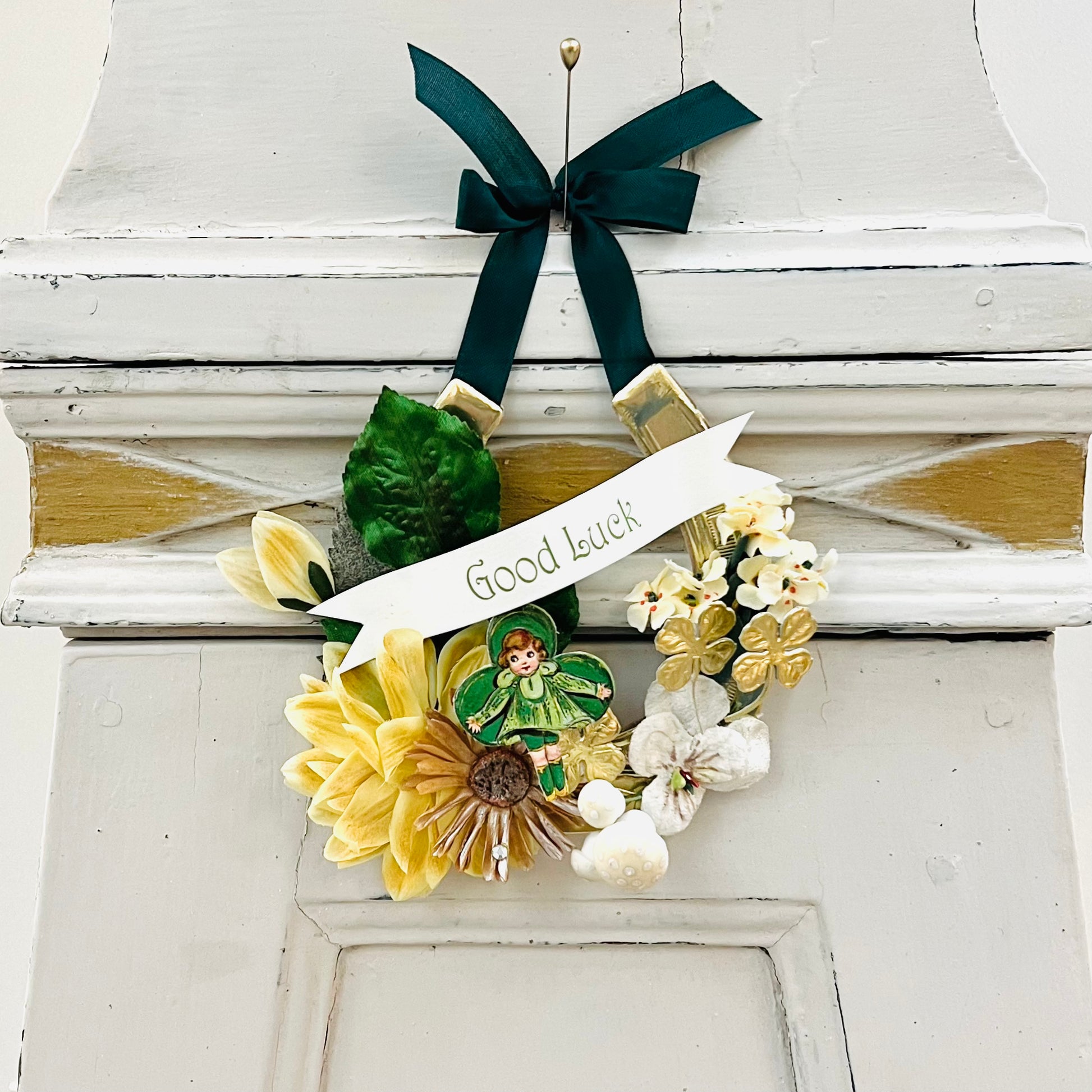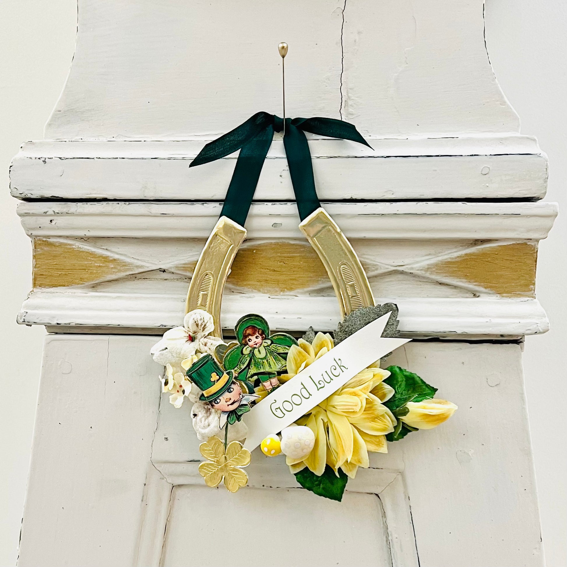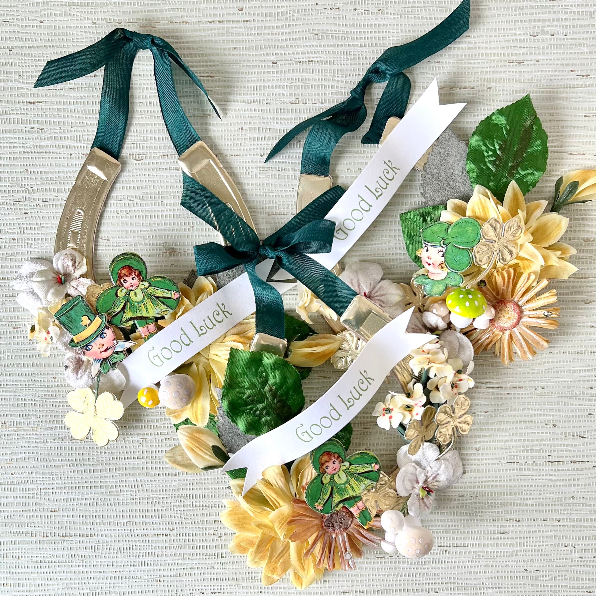 Who doesn't need some good luck? Give, or keep, this adorable Dresden Horseshoe ornament embellished with vintage millinery flowers, spun cotton mushrooms, antique victorian scrap, and vintage hanging ribbon. Perfect for St Patrick's day, or any time of the year actually.