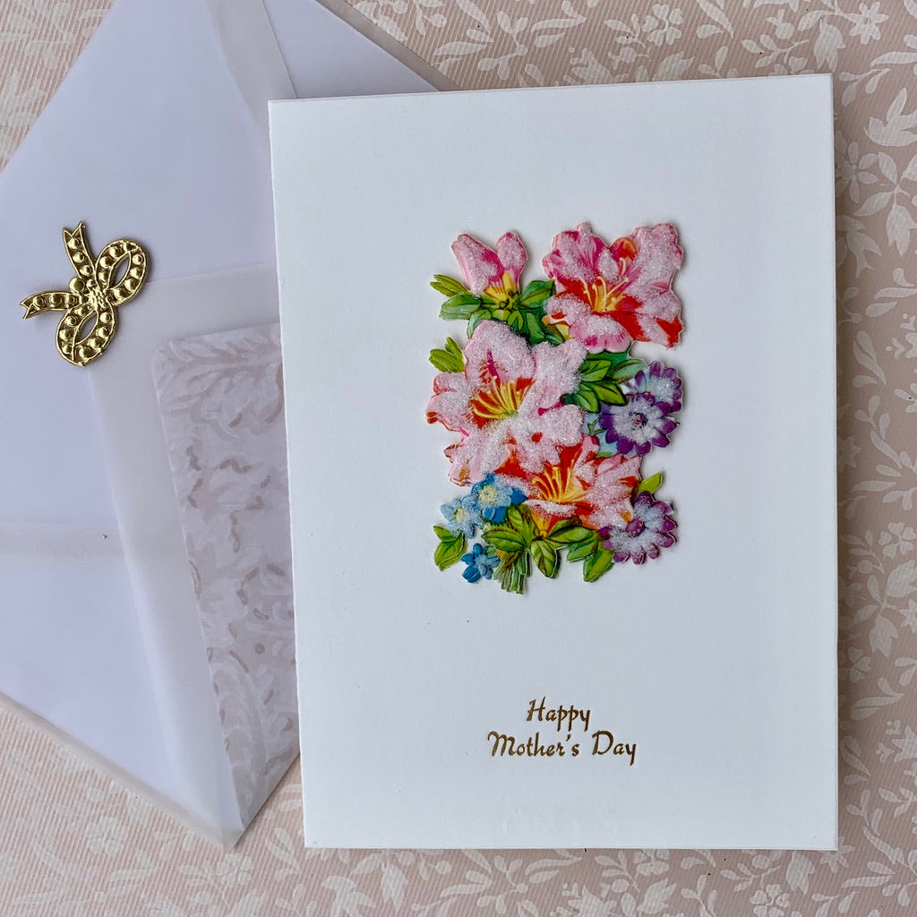 A beautiful, hand made card, printed on cotton letterpress paper, with layered vintage scrap ephemera, "sugared" with glass glitter. Accompanied by a charming vellum envelope, lined with our signature papers, seal with a pretty Dresden bow.