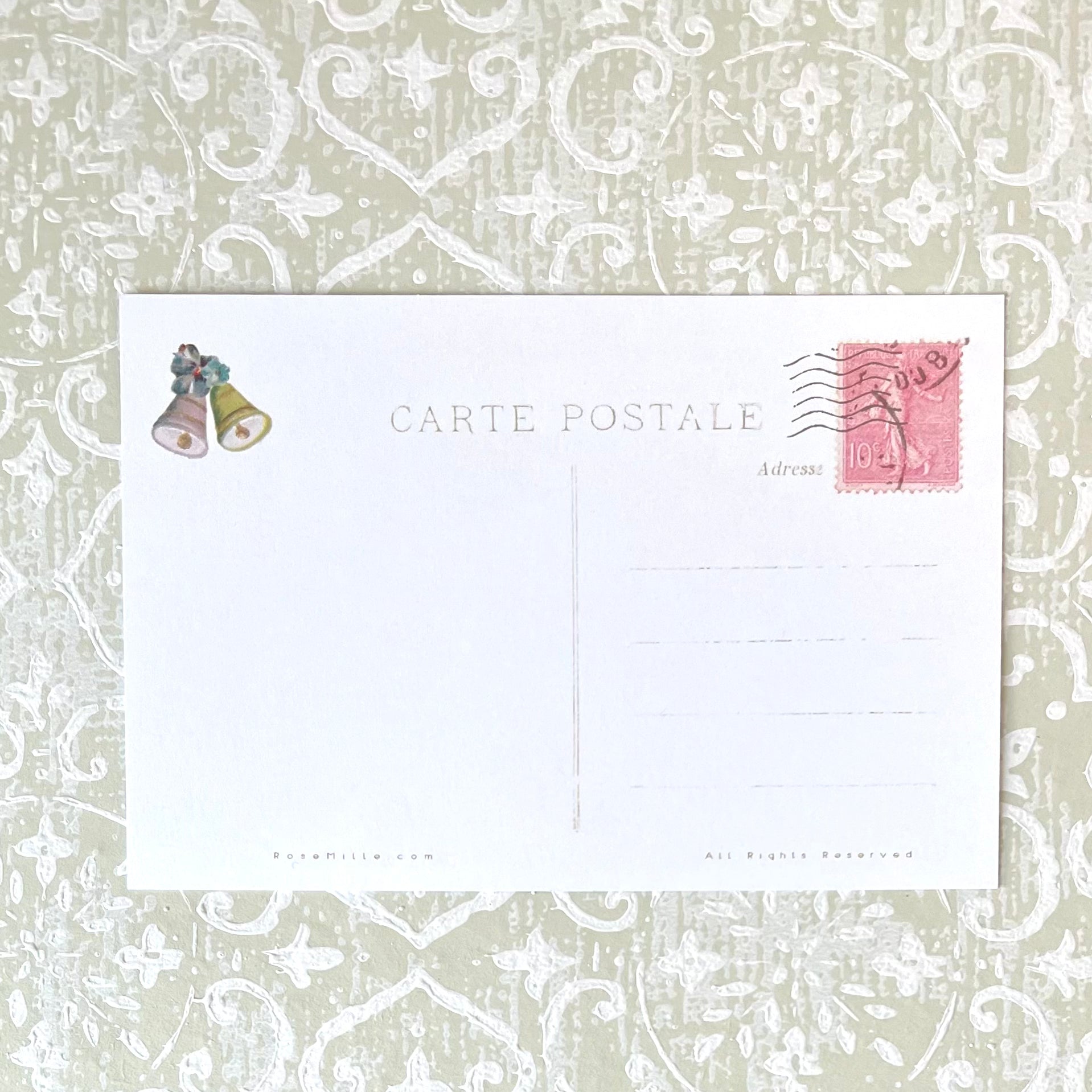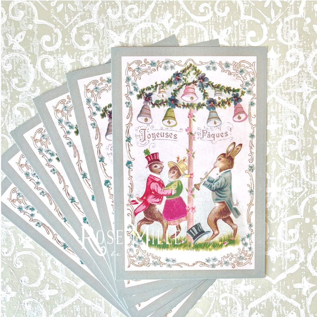 Vintage image post-card of dancing rabbits with a charming French greeting for "Happy Easter" and a "Carte Postale" image on the back. Use these cards to layer and decorate a greeting card, or just send as is.