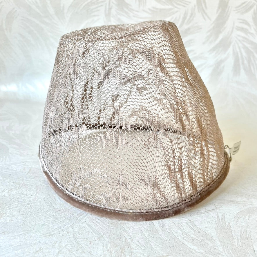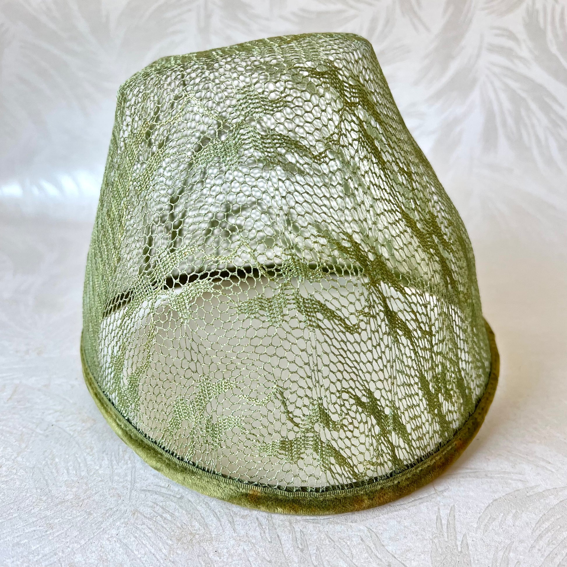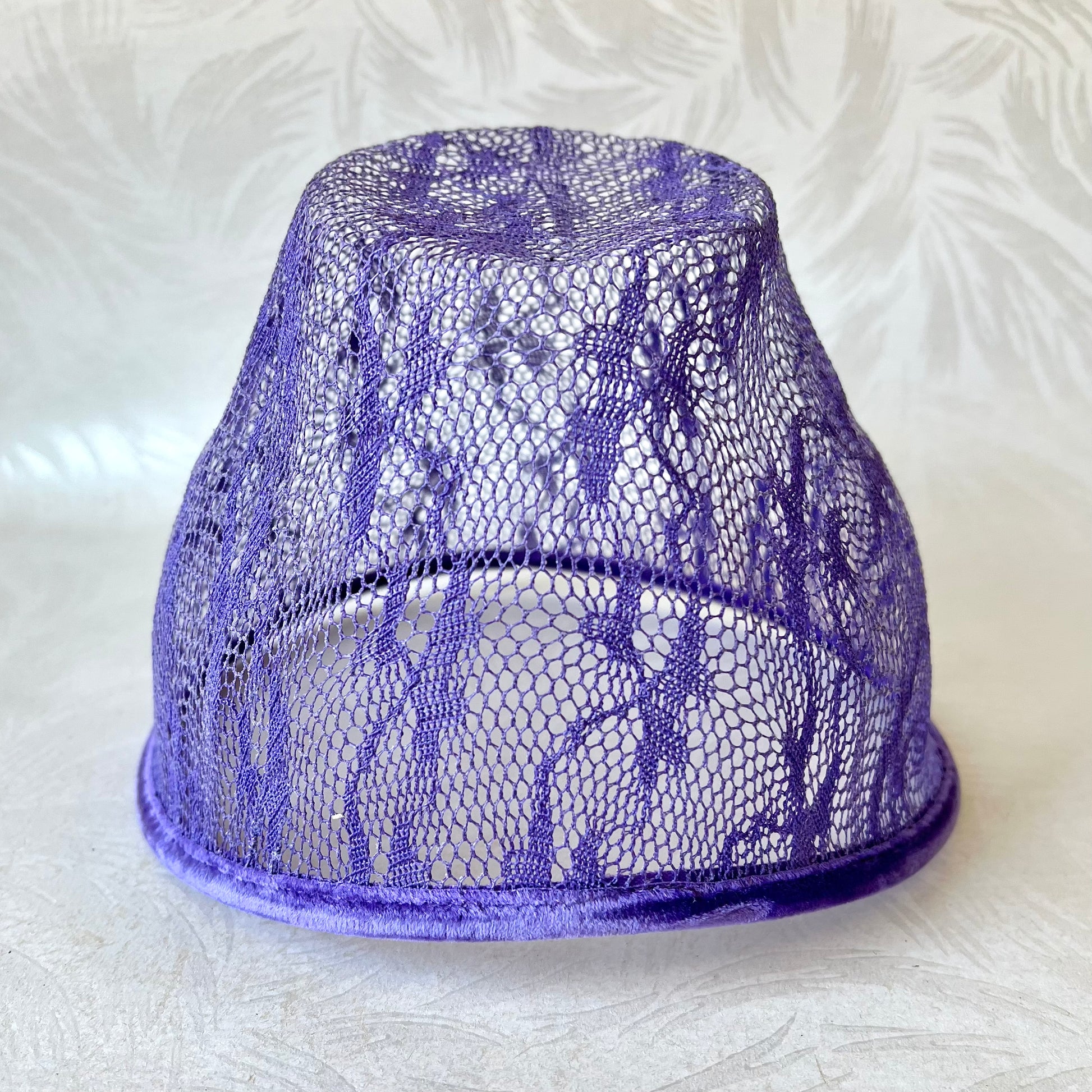Rare starched stiff lace net hat frames with velvet edges, in a Toque or Turban hat shape from the Pearl Hemenway Milliner's lot of San Francisco.