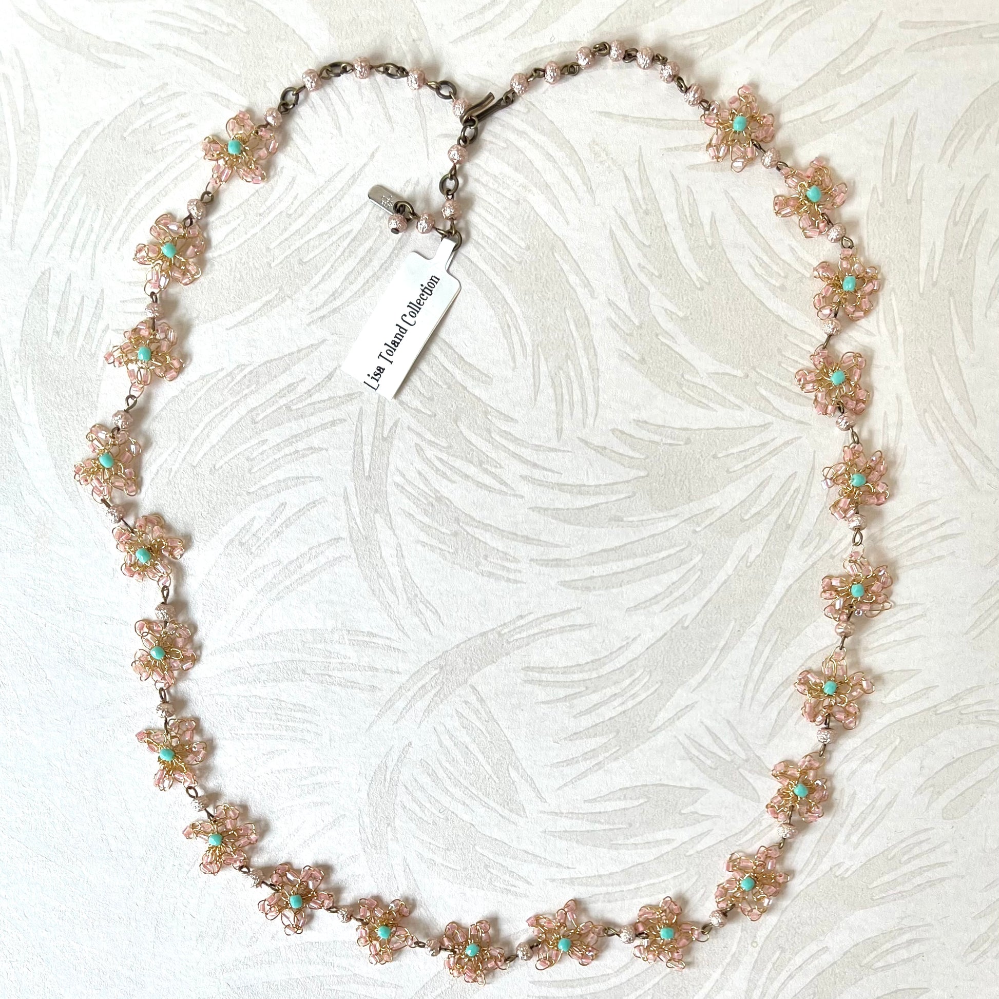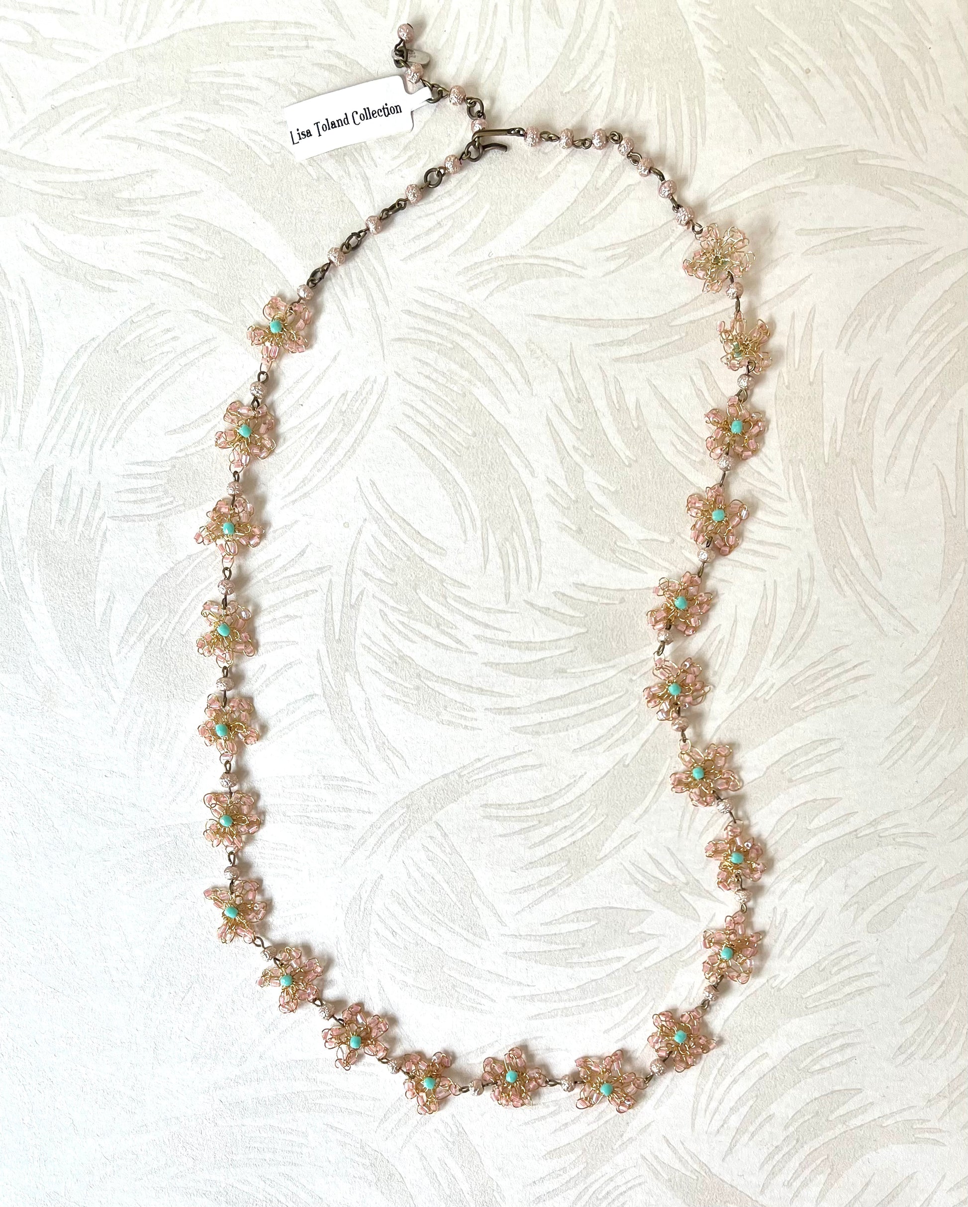 Delicate gold wire, crocheted into flowers with aqua glass bead centers and tiny pink glass bugle beads in the petals. Flowers are separated with textured pink gold beads, with the same beads made into the adjustable clasp.
