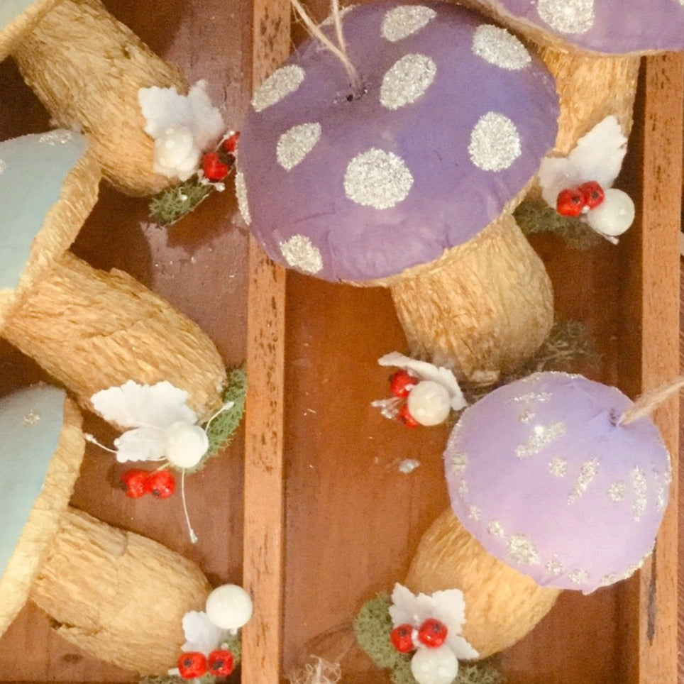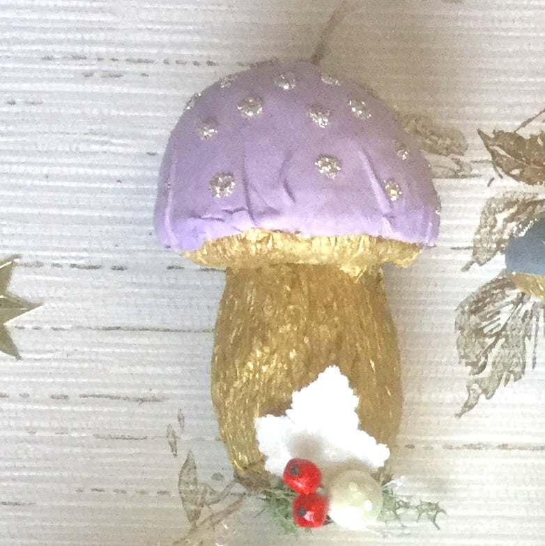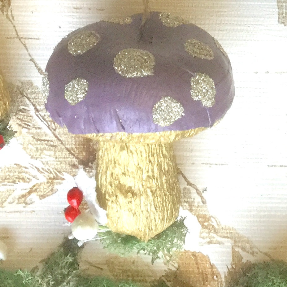 Rescued from the forest floor are these delightful glitter dotted mushrooms brimming with life in whimsical colors and sizes. Hand painted crepe, glass glittered, and decorated with vintage berries, mushrooms, sparkly stamens, and velvet leaves.