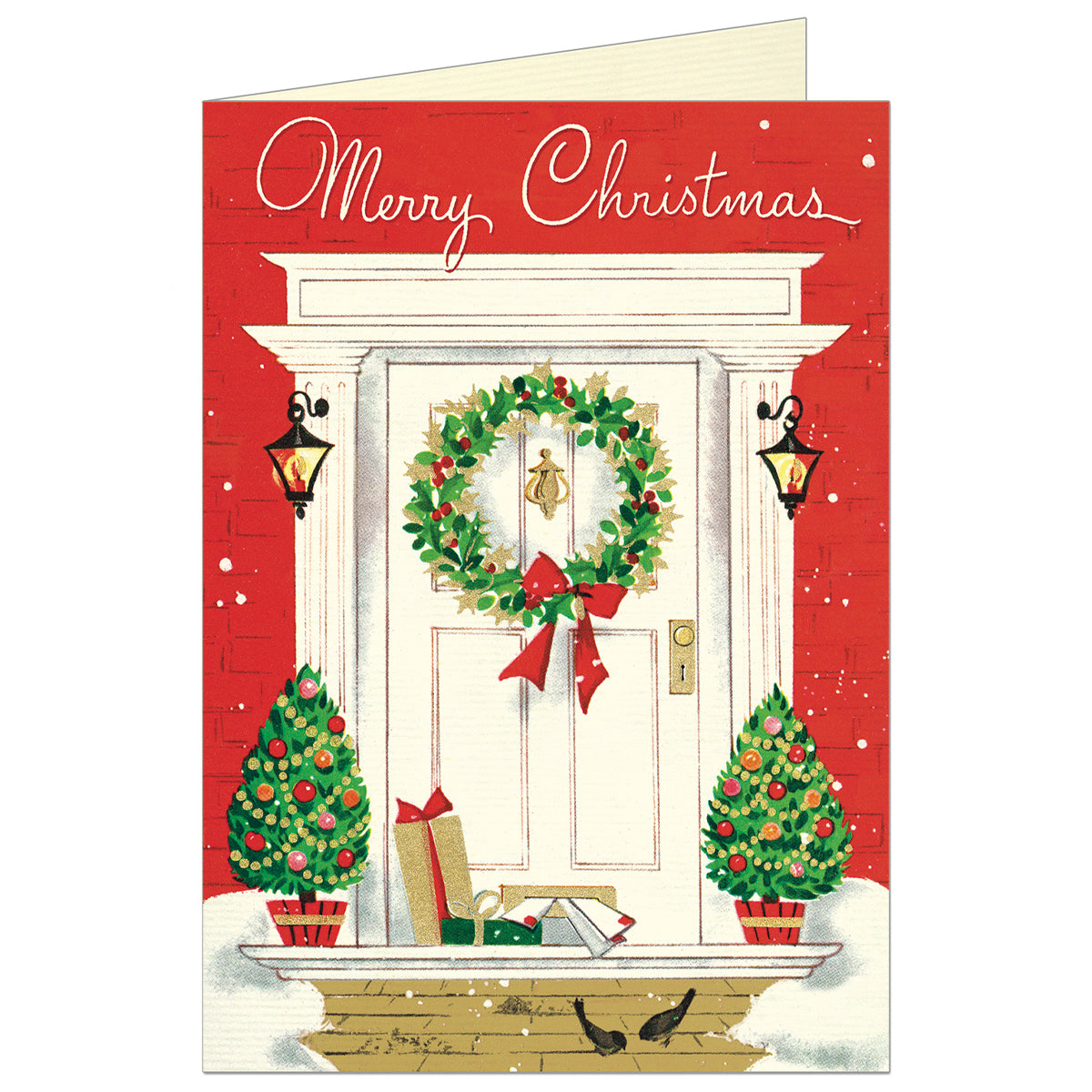 Nostalgic Christmas greetings on a glittered vintage image, Cavallini Italian papers card.