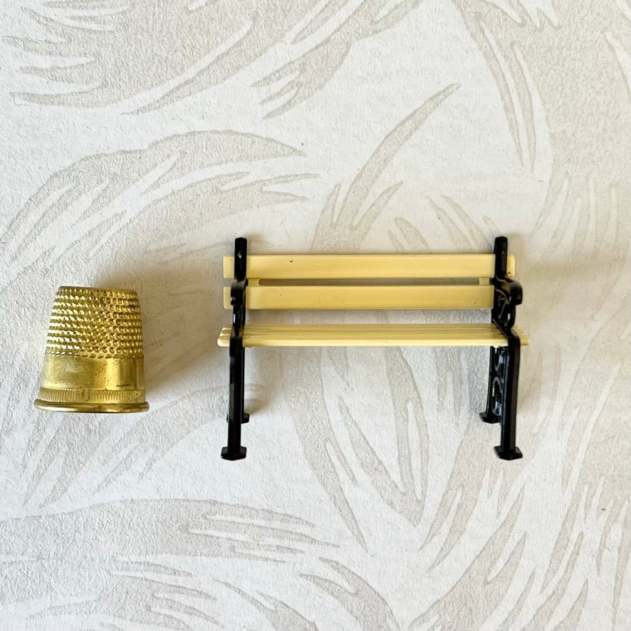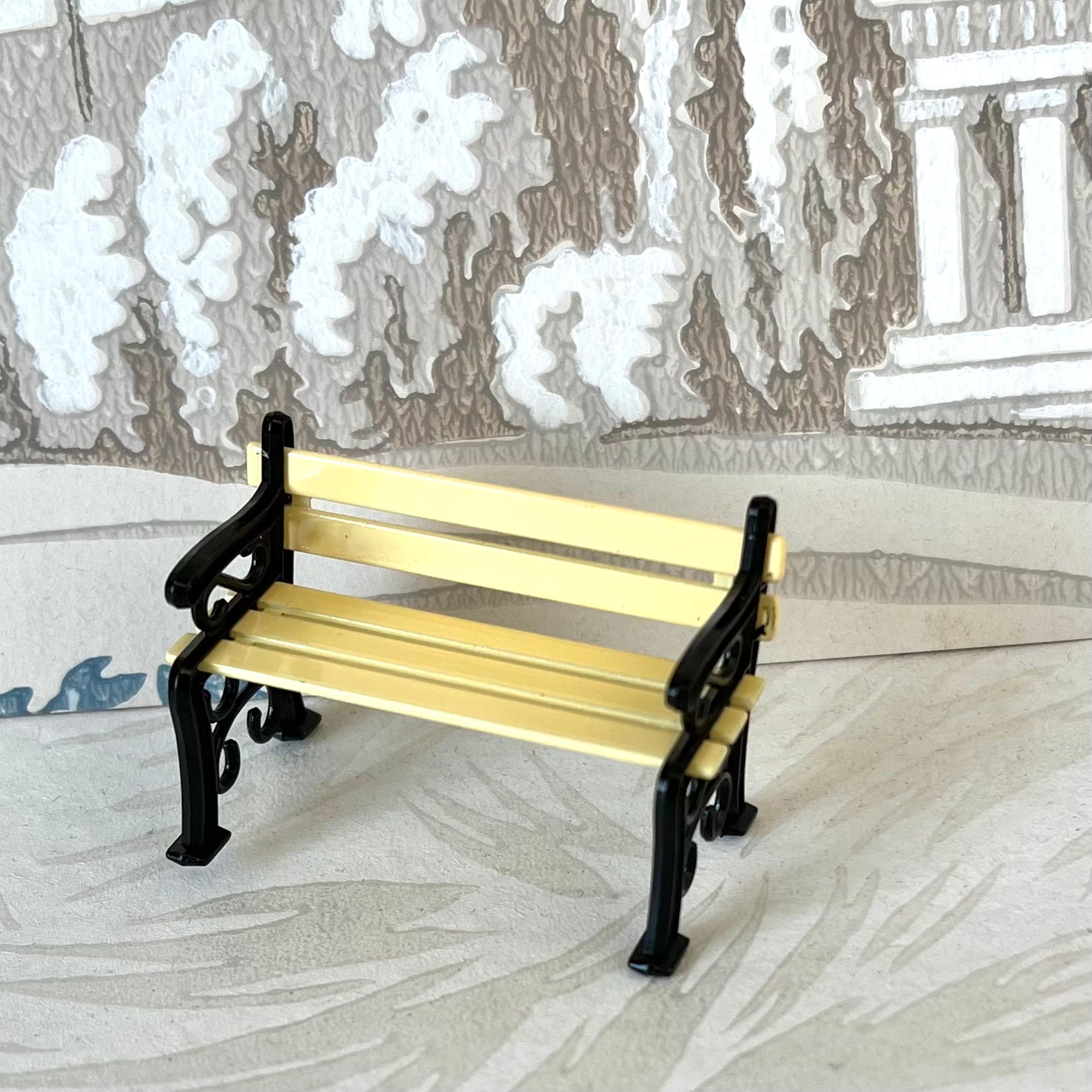 The quintessential park bench in miniature. A charming accessory for your next diorama project, doll house, train set etc. All metal bench with ivory slats and black fancy sides. Can be painted.