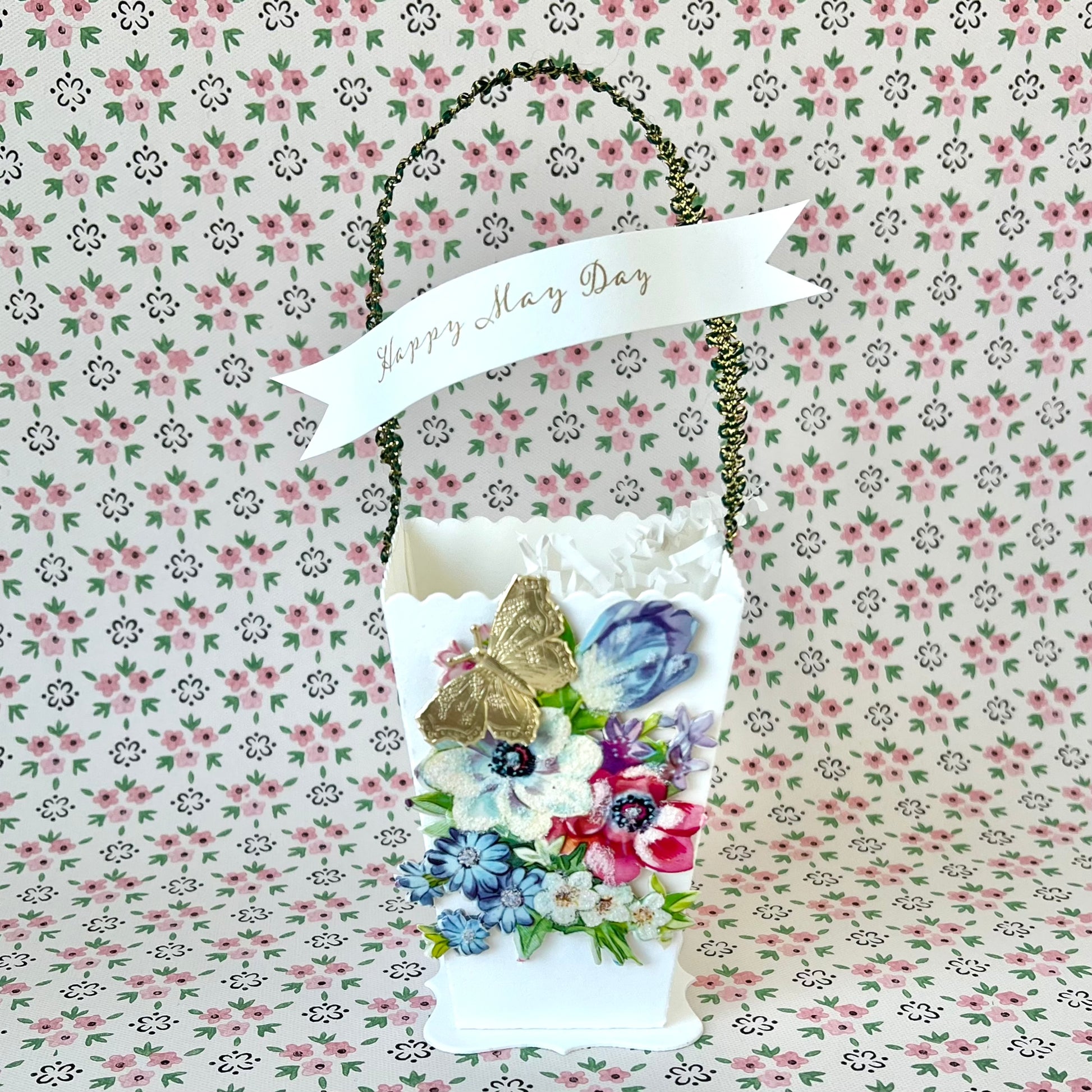 Materials include a letterpress die-cut paper basket and bottom, "Happy May Day" and "Happy Mother's Day" banners, double layers of floral vintage scrapbook pictures, sweet little golden die-cut Dresden butterflies, glass glitter, foam adhesives, and some unique vintage metallic and green wired trim for the handle. A truly special gift.