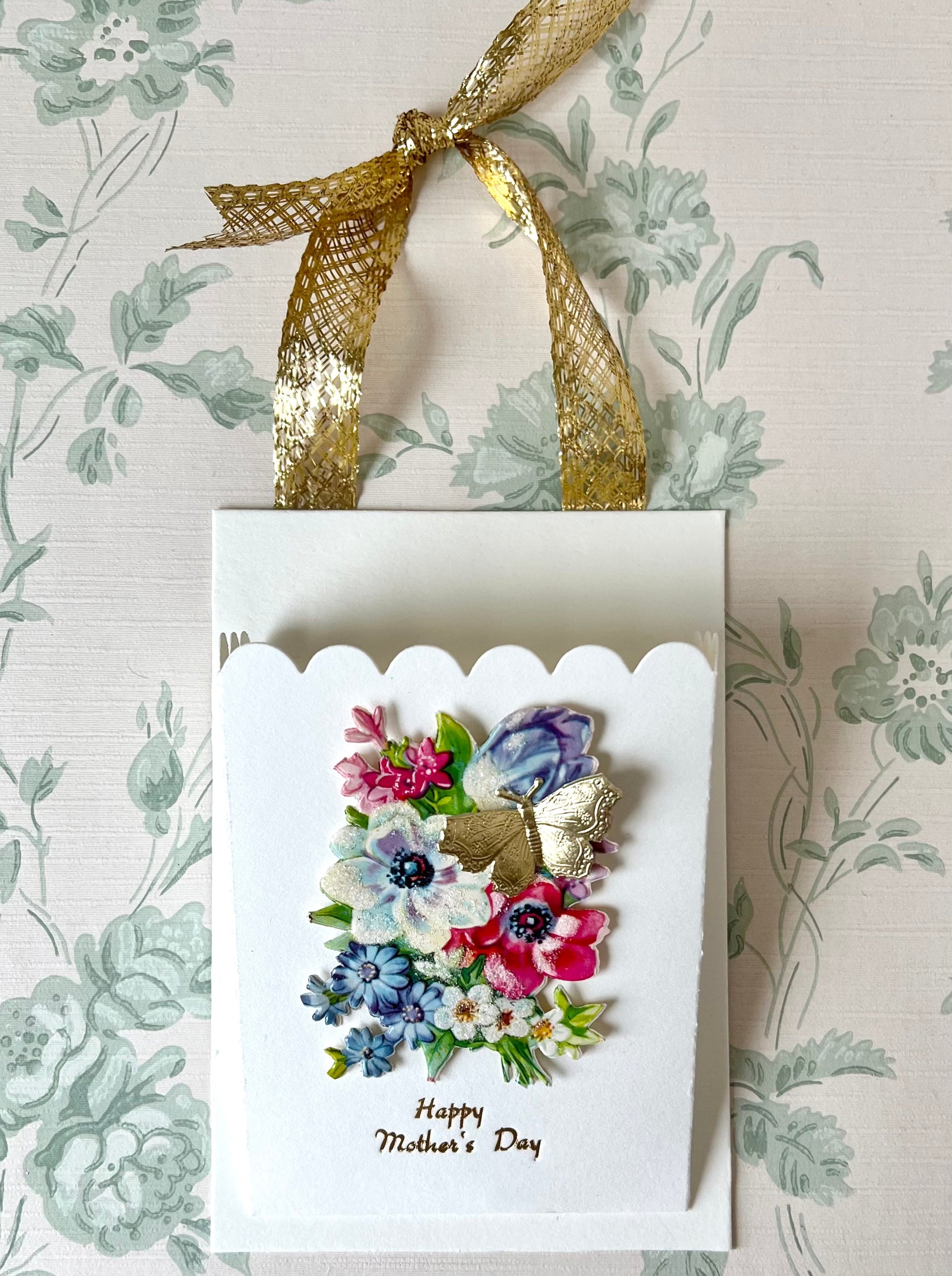 Celebrate mother's day with this charming wall pocket made with our wonderful vintage materials. Leave a pretty posey hanging on a door or on her wall. Hold sweet little cards or letters, dry or silk flowers, maybe even some treats.