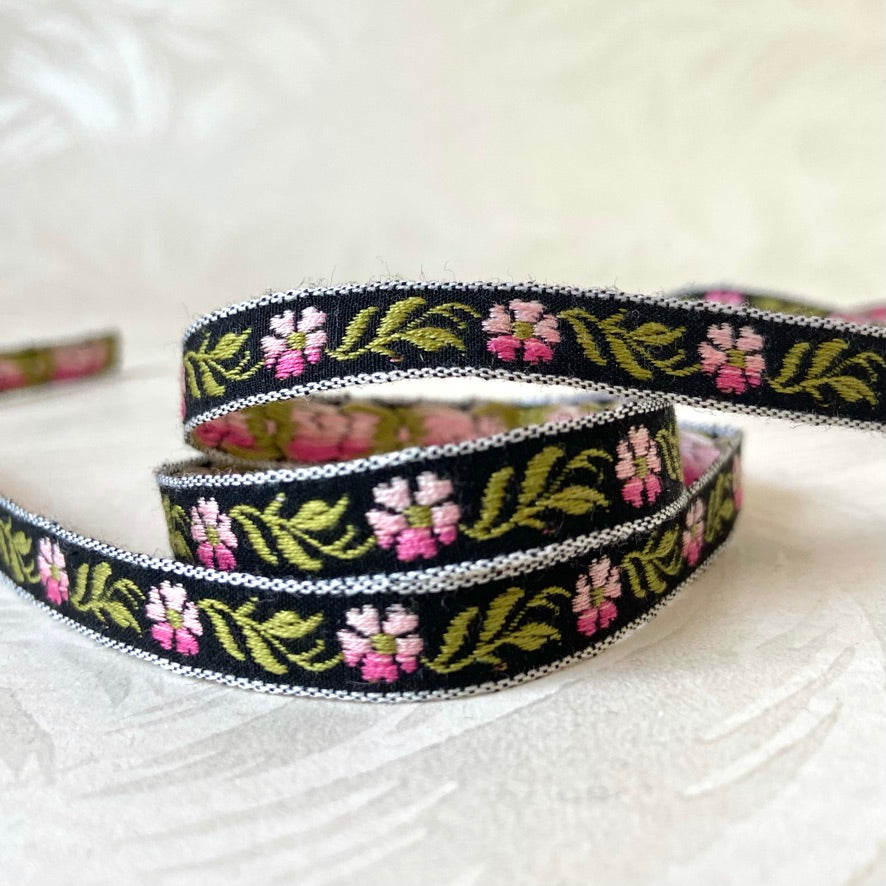 Floral Jacquard. This high-quality, colorful embroidered jacquard trim features a 2-tone daisy pattern with green stem and leaves on a black background with a white border. 100% cotton. Made in Germany.