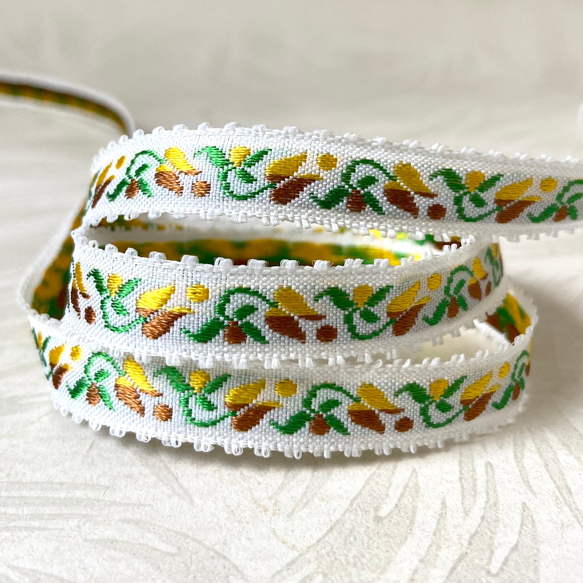 Vintage tulip jacquard with picot edges.