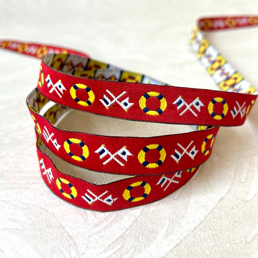 Nautical theme jacquard with a beautiful nautical design of a life preserver ring followed by a pair of crossed flags on a red background.