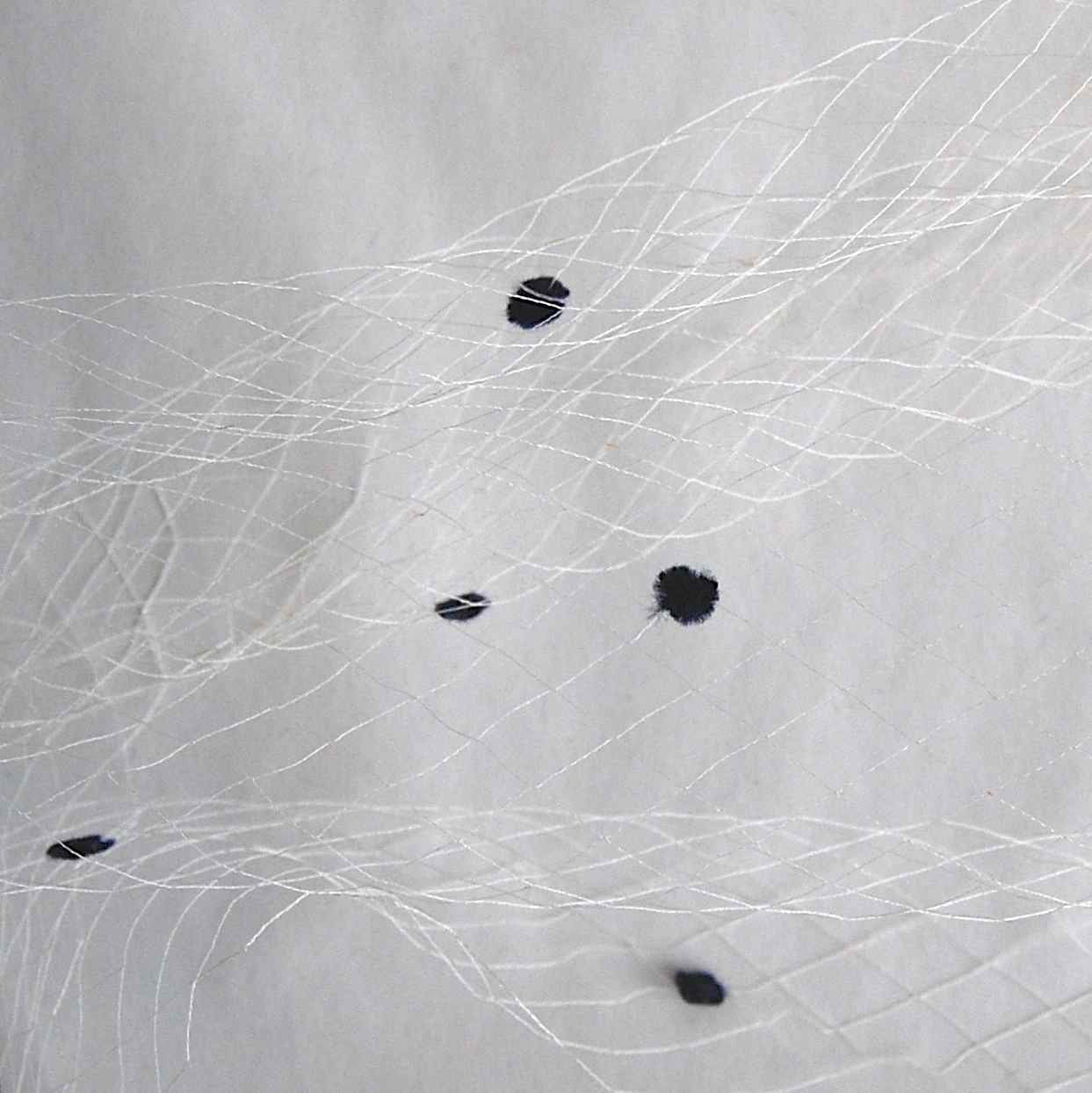 Rare silk netting, also known as French or Russian veiling. Very dark navy chenille dots sprinkled onto open criss cross ivory collored netting. So dark the dots are practially black.