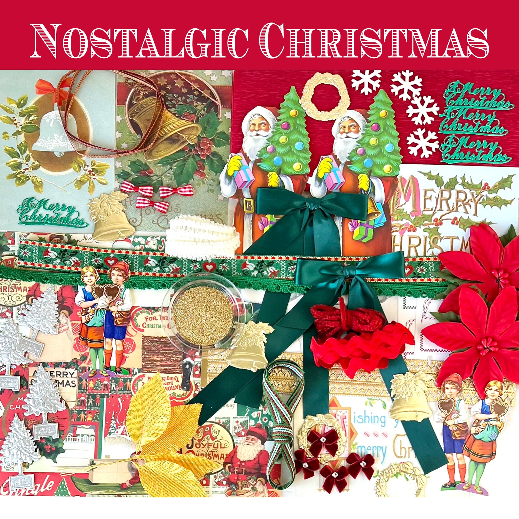 Featuring a collage of old time Christmas advertisements, 4 of our signature Vintage Christmas Postcards, a pack of Europe Avery Labels, a half sheet of Holiday Red Dennison Xtra Fine Crepe, 2 pairs of Bavarian Children scraps with a very Hansel & Gretel vibe, and an identical pair of large Santa Scraps. Yes, of course there are Dresden die-cuts; 6 rows of pennant borders in antique gold, 4 heavy gold bells adorned with holly, 3 golden wreaths, 4 silver Christmas trees, and 4 "Merry Christmas" script in Christmas green. We have added 2 large vintage forest green satin pre-tied gift bows, 3 jaunty red checked bow ties, 4 scarlet velvet bows with rhinestones, 4 squishy snowflakes, and 2 very large vintage poinsettia gift toppers. Our ephemera collections would not be complete without a wonderful selection of vintage ribbons & trims; we have cut one yard lengths of; a vintage green jacquard with red and white images of hearts and flowers, cotton green crochet lace, an interesting stiff trim, very nostalgic, off white picot edge trim, a woven red-green-white trim, red cotton chenille, red rick rack, more forest green satin, and 4 shimmering gold leaves. Top it all off with a scoop of Gold Glass Glitter.
