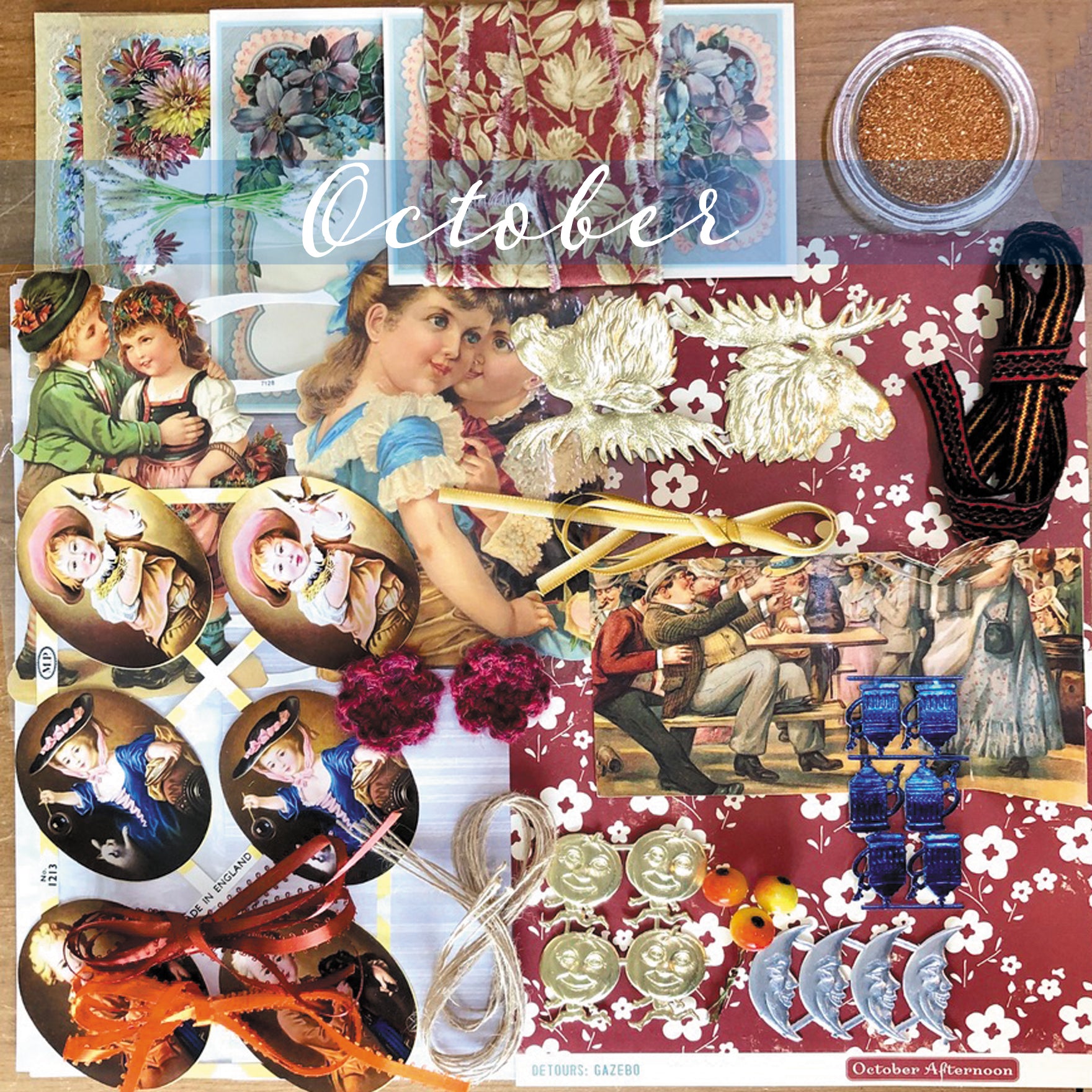 In this collection are 2 vintage scrap pictures, 4 different Dresden die-cuts, copper glass glitter, designer papers, printed 4 x 6 cards, fuzzy rose hips, 5 different ribbons, jute, spun cotton apples, and crocheted flowers.