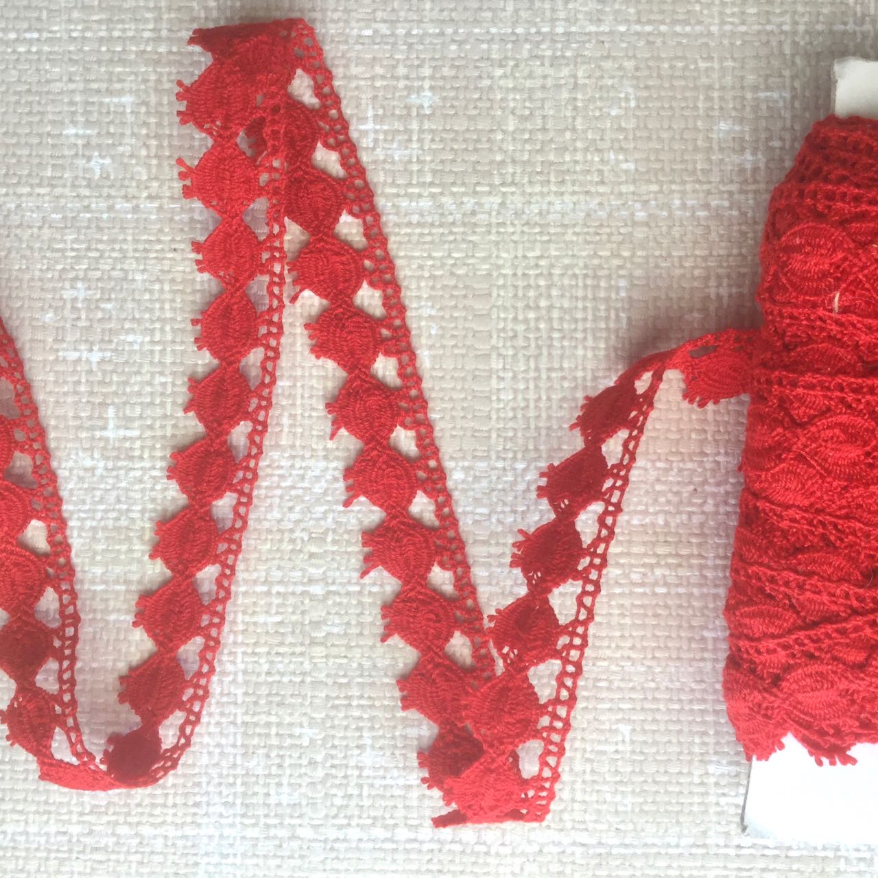 Authentic cotton trim, found in France, with a woven oval and picot repeating design.