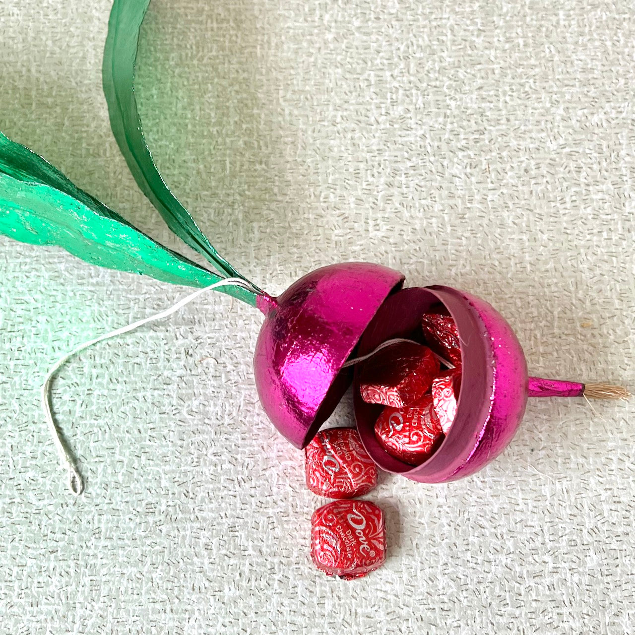 Just look at these amazing metallic foil covered "boxes" in the shape of a beet, complete with long green foil leaves, and stringy roots. The box separates by gently unwrapping the string from the leaves and gently pulling the sides apart. Now it can be filled with a small gift, chocolates or non-pareils.