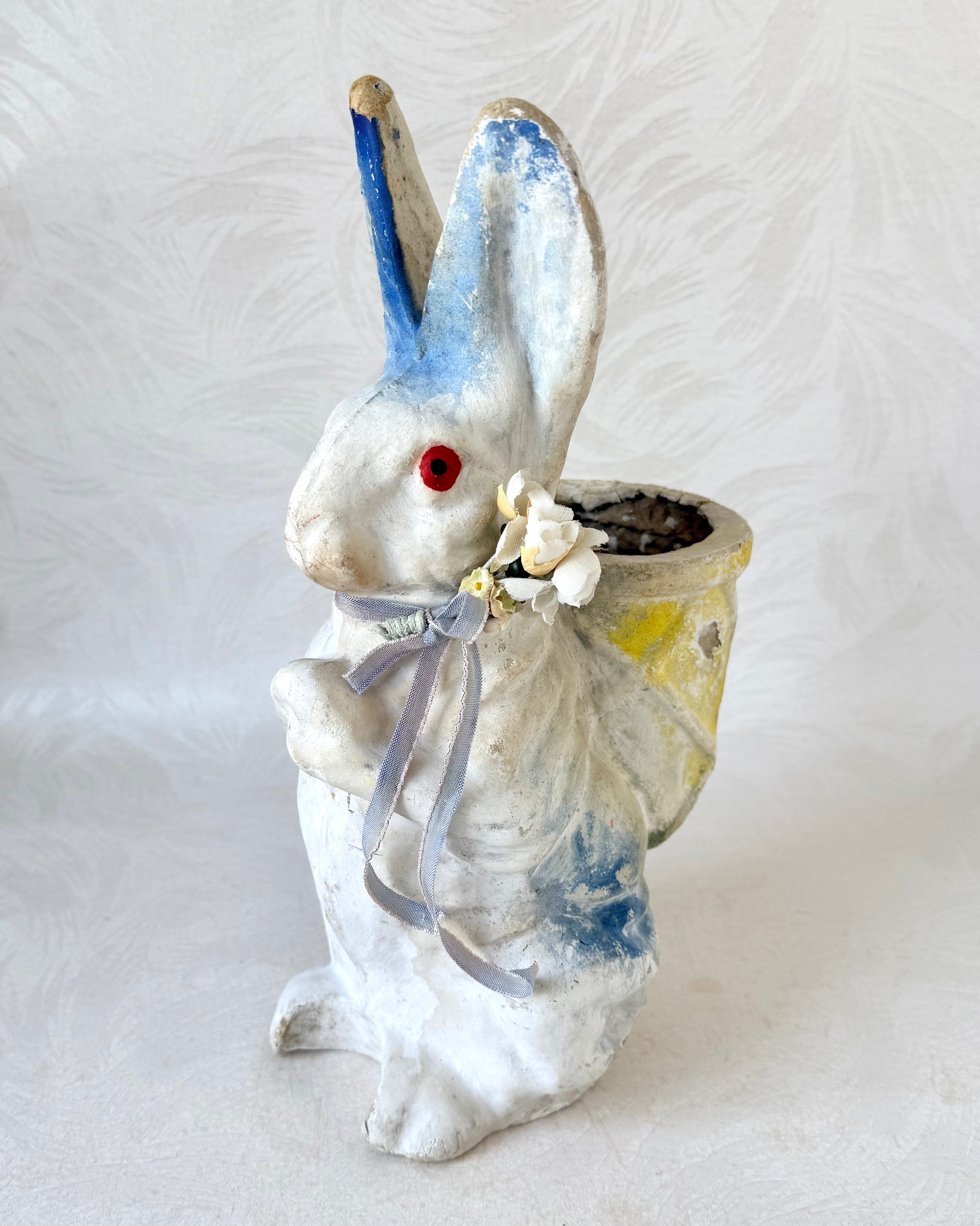 Rare blue paper maché rabbit figure with yellow basket, pretty flowers and blue ribbon bow.