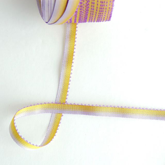 One of our all time favorite go to trims when we need something special. Almost a Grosgrain texture, with variegated color and a little picot edge on one side.