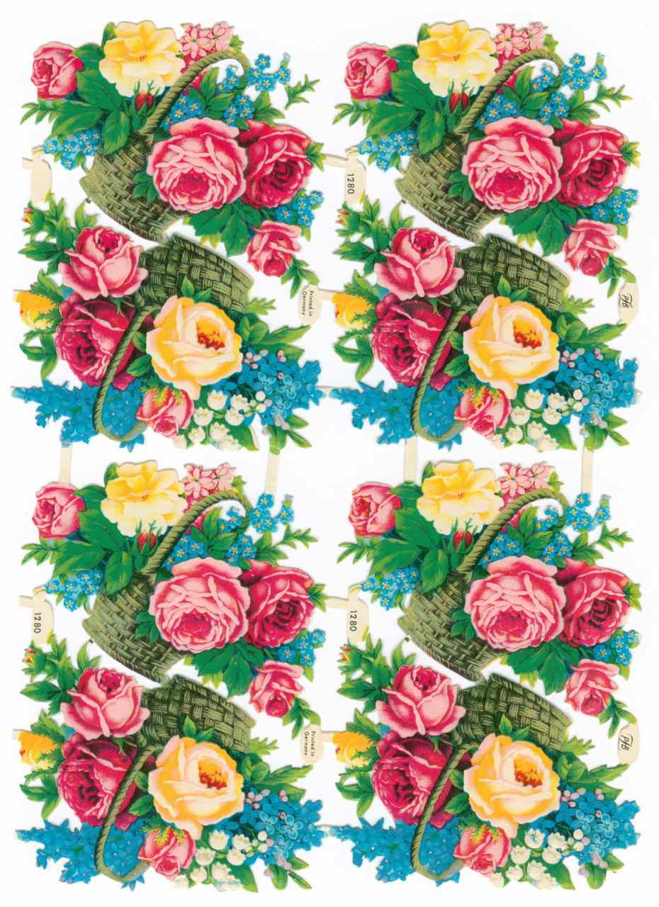 Baskets of Flowers, 8 Piece Vintage die cut Scrapbook Pictures