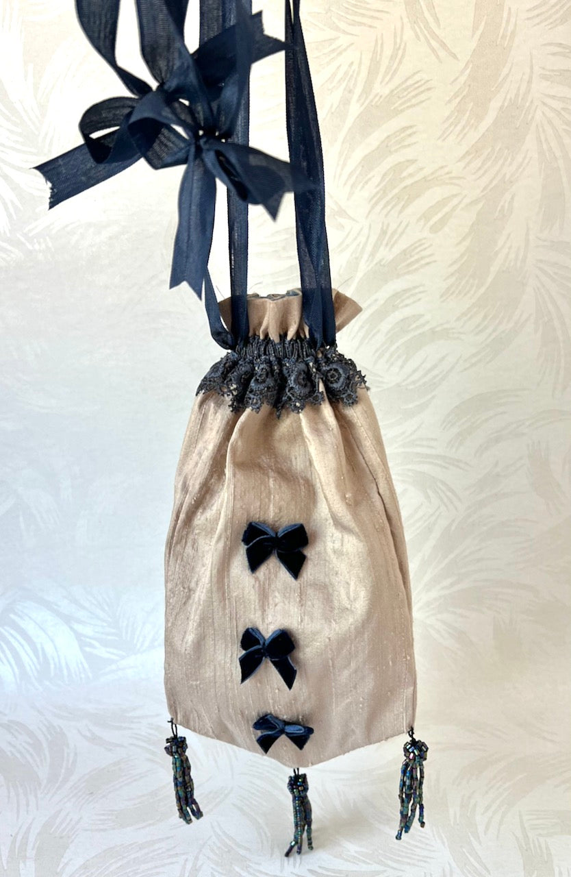Make a pretty three sided reticule, that even Jane Austen would love to carry, out of taupe silk dupioni fabric, hand dyed vintage lace, velvet bows, vintage rayon ribbon, vintage satin ribbon for lining, and glass beaded tassels.