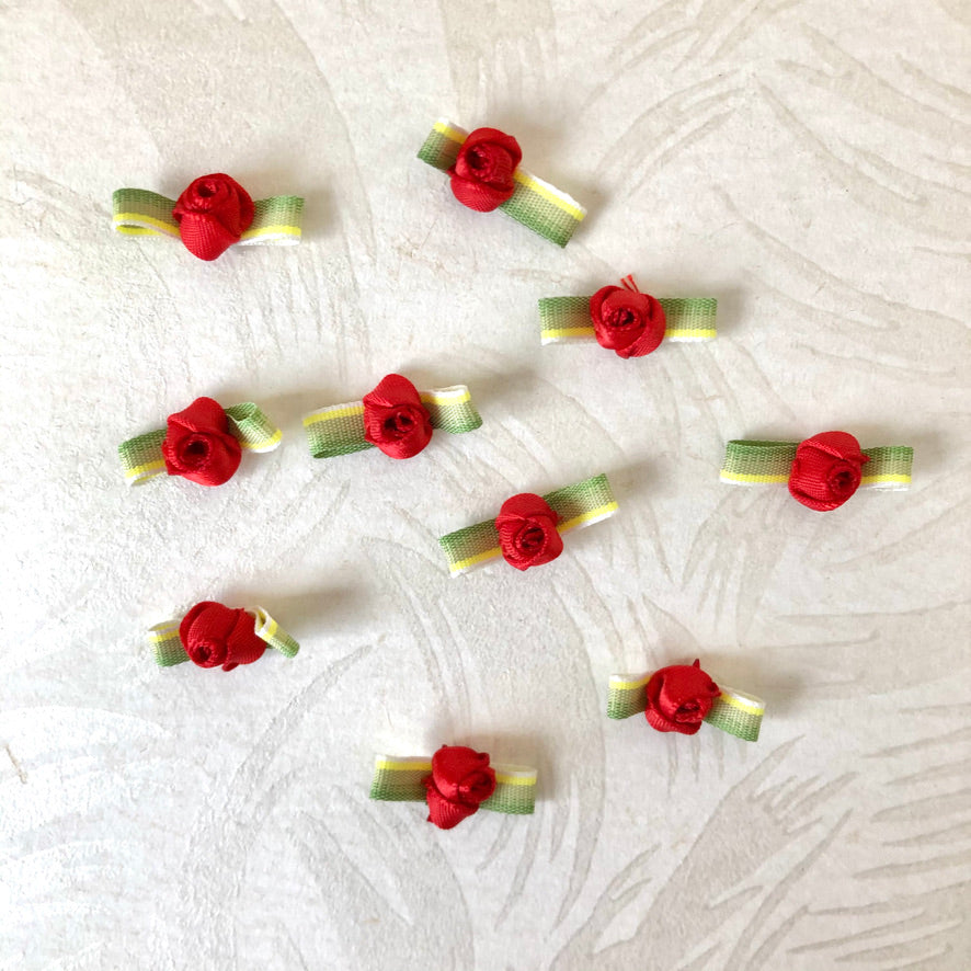 Pretty vintage rosebuds, hand stitched on a fold of ombre green ribbon forming leaves. Wonderful to embellish greeting cards, jewelry, decorations and ornaments. So adorable, they measure 1"x ¼".