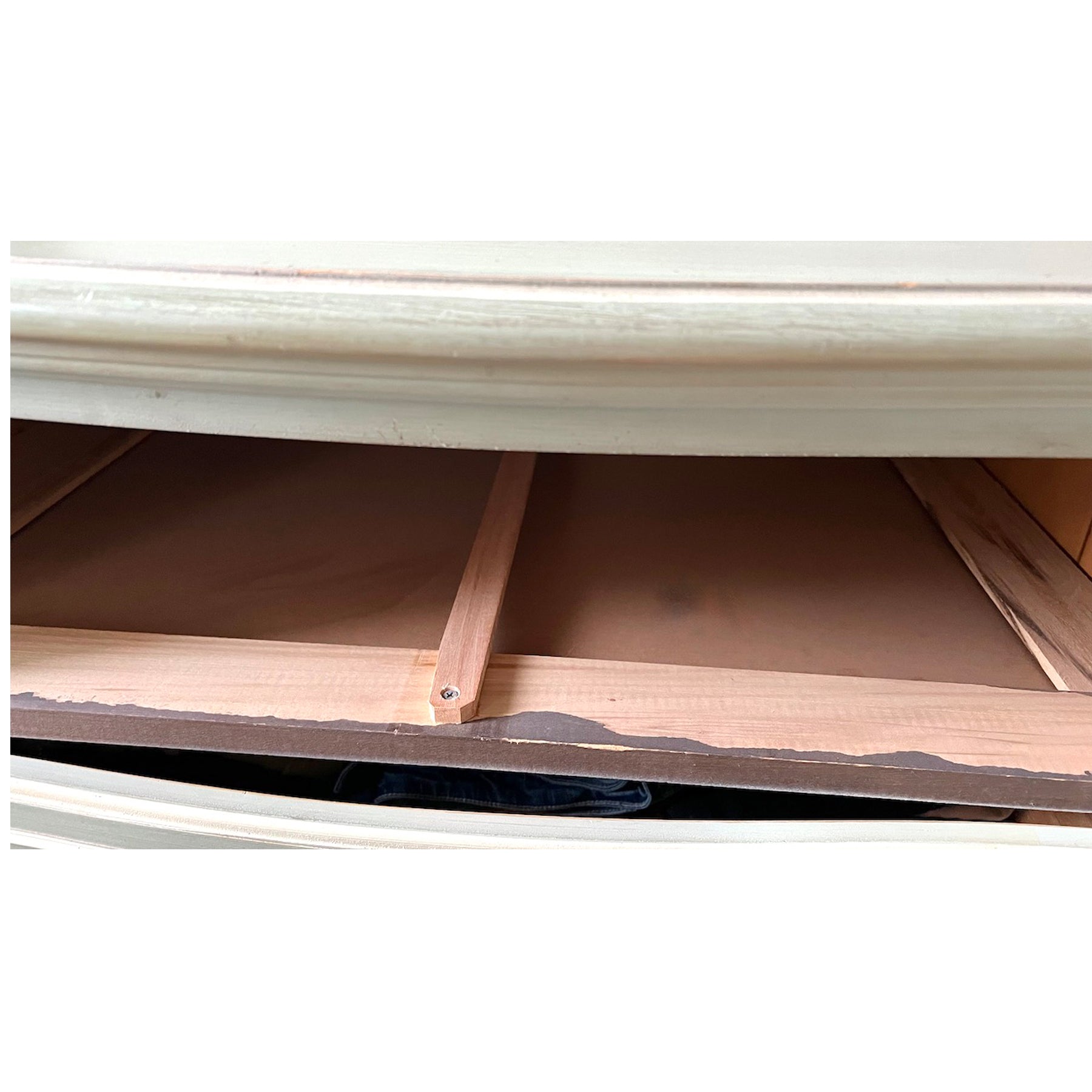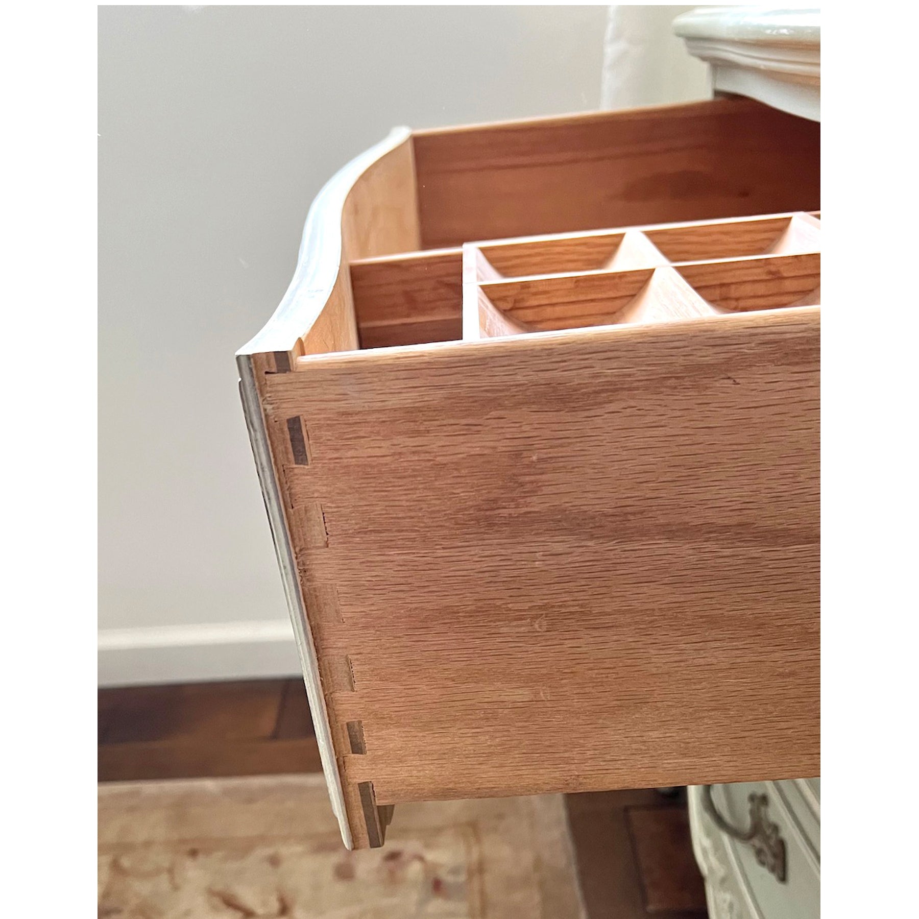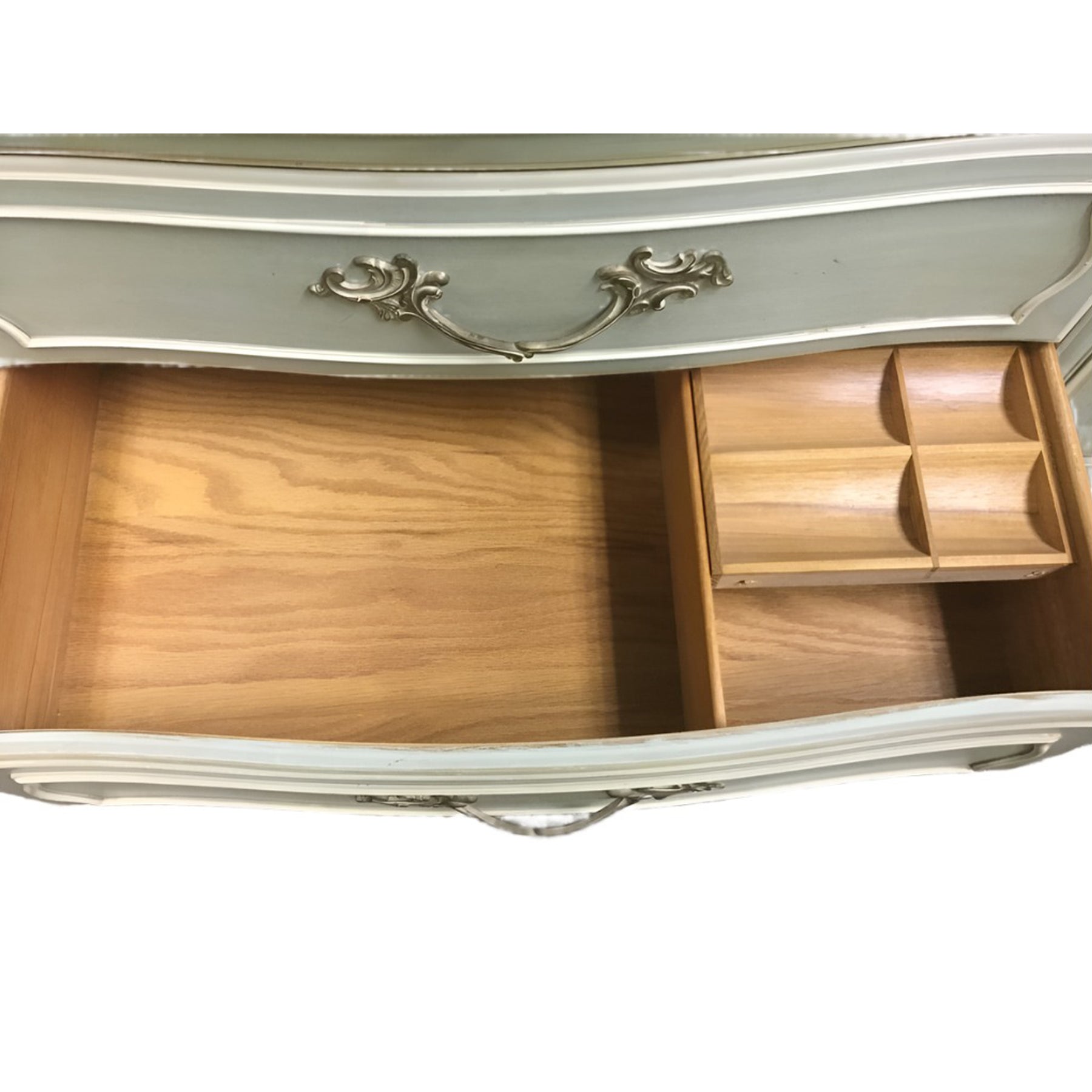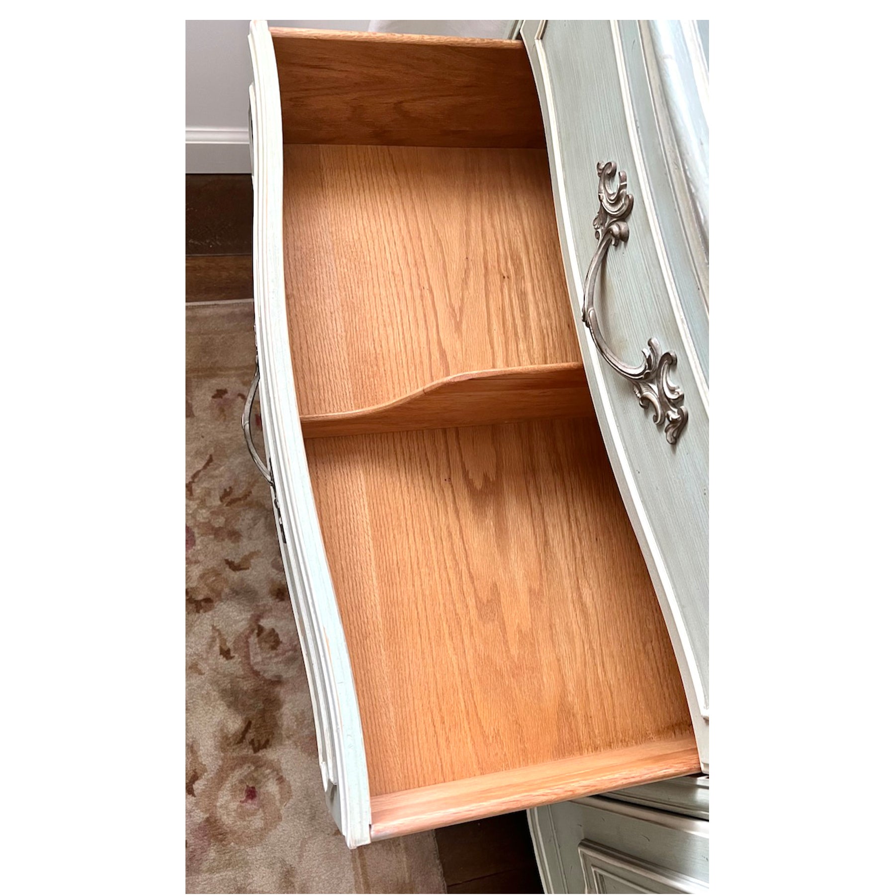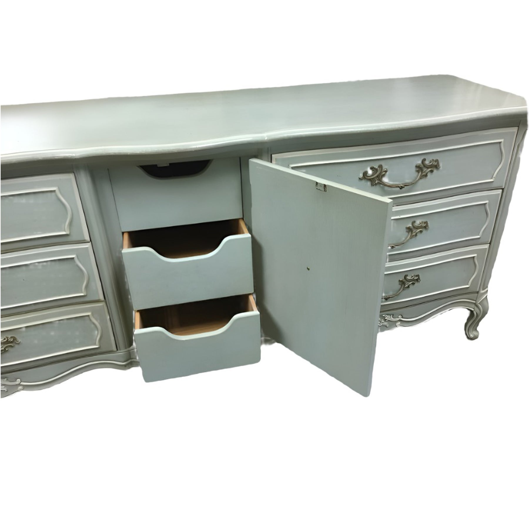 Stunning mid-century French dresser in the most dreamy Robin's Egg Blue color, in excellent condition. Solid hardwood construction with 9 dovetailed drawers, 3 pull out drawers are behind the center cabinet door. One drawer has a sliding tray for change and jewelry, another drawer has a sloped divider. Beautiful raised decorative carved embellishments in an ivory color, and nice french style metal drawer pulls with one circular pull on the door. There are shelves in between the drawers and wood drawer guides. Everything is original as manufactured in the 1960's. They just don't make furniture like this anymore.