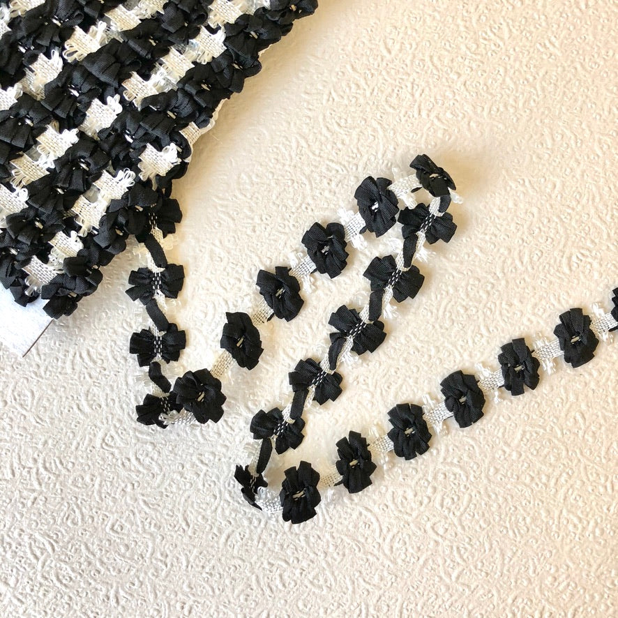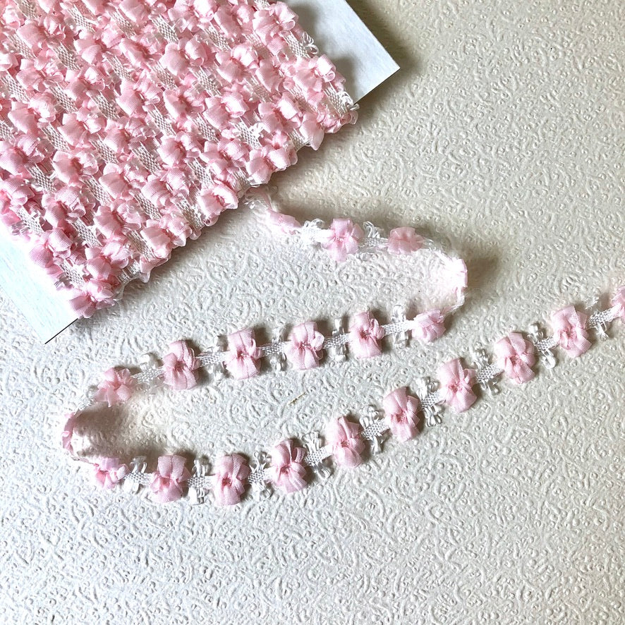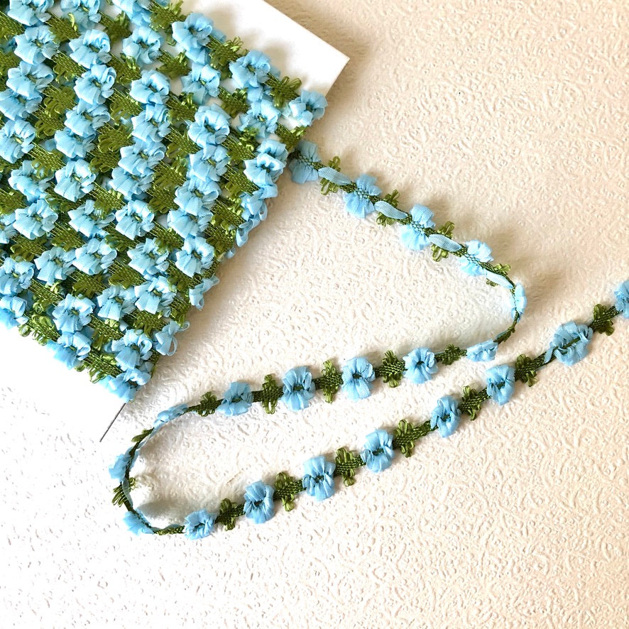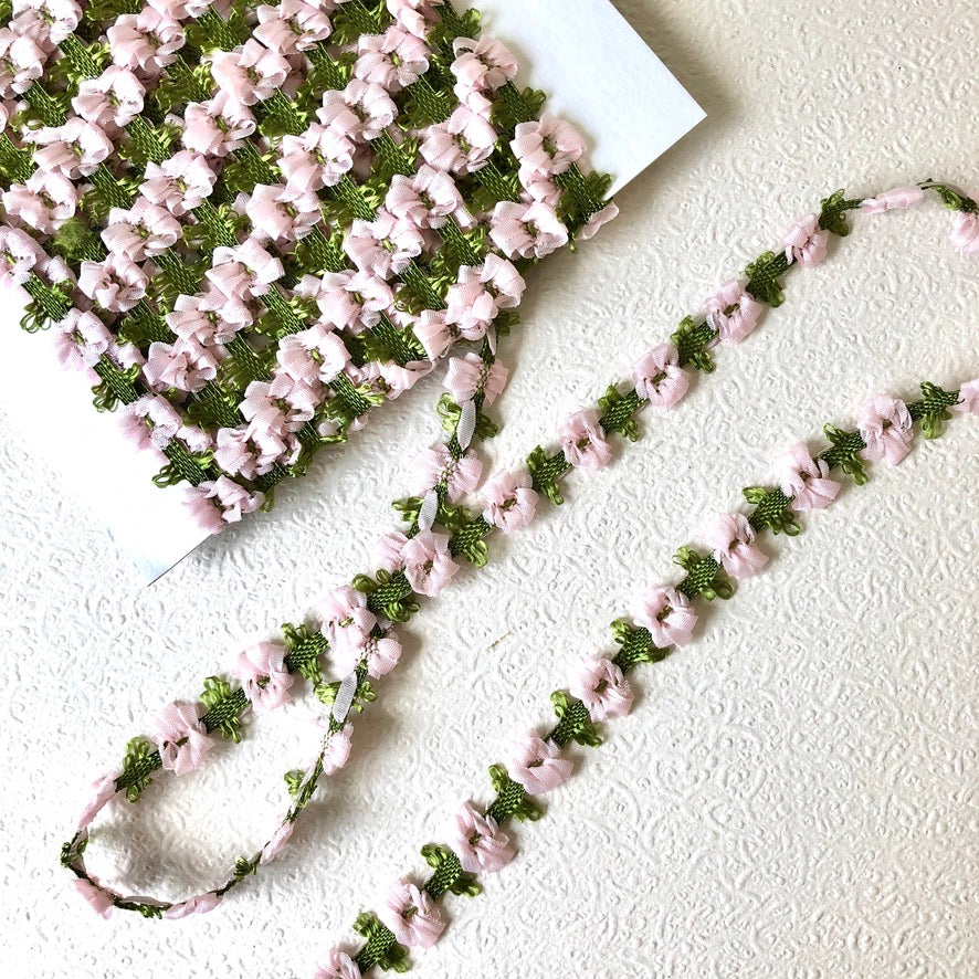 Pretty taffeta flowers strewn along a green or white picot ribbon trim. Trim is soft and very French. Sew it along the edge of ......everything. You can also use this trim in paper crafting. Endless possibilities.