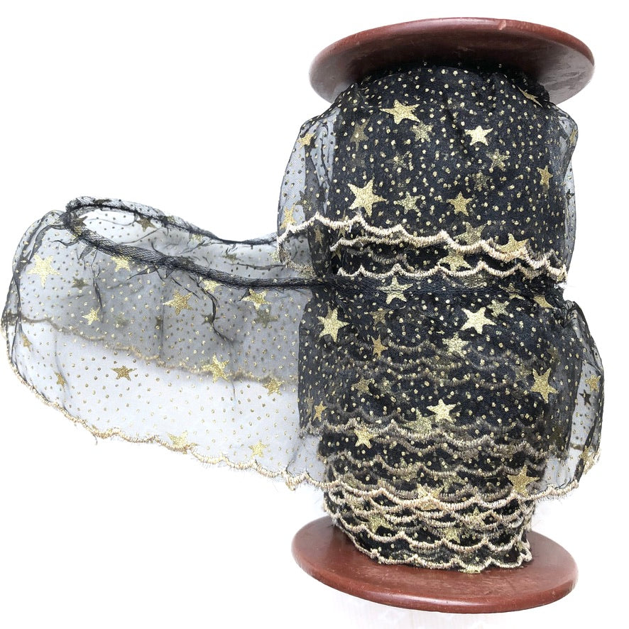Black organdy ruffles with scalloped gold stitched edges sprinkled with glitter stars! Oh my! Doll Skirts, sleeve ruffles, purse edges, lampshades. could all be made prettier with this vintage trim.