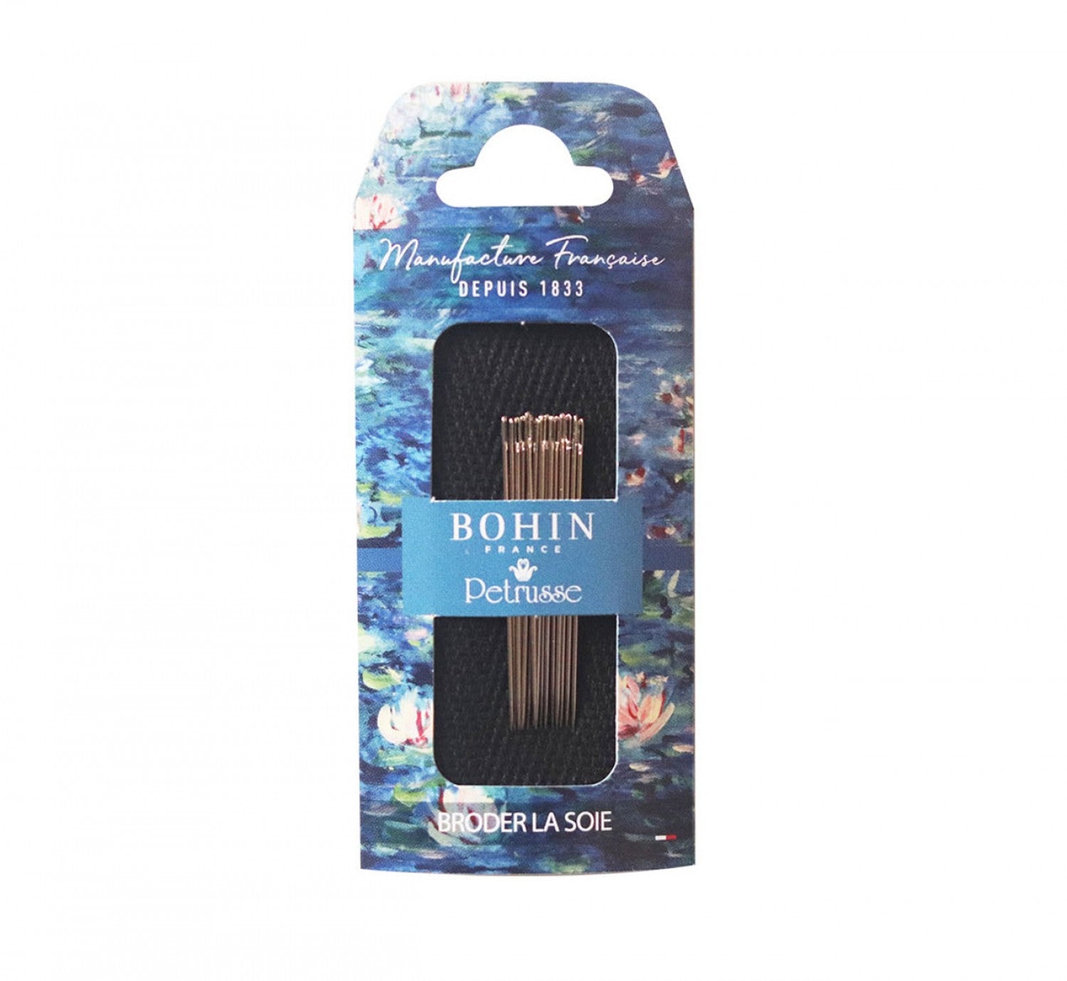 Pouch of 15 N°10 embroidery needles for silk - The silk square that dresses this pouch represents the Nymphéas (Water lilies) of Claude Monet. This design was created in partnership with the "Réunion des Musées Nationaux". Petrusse, the French House of reference in the creation of scarfs and silk scarfs, has teamed up with BOHIN France to offer you 3 needle pouches.