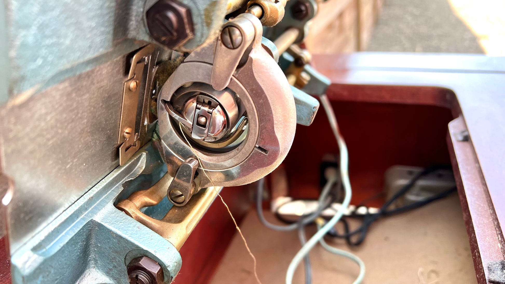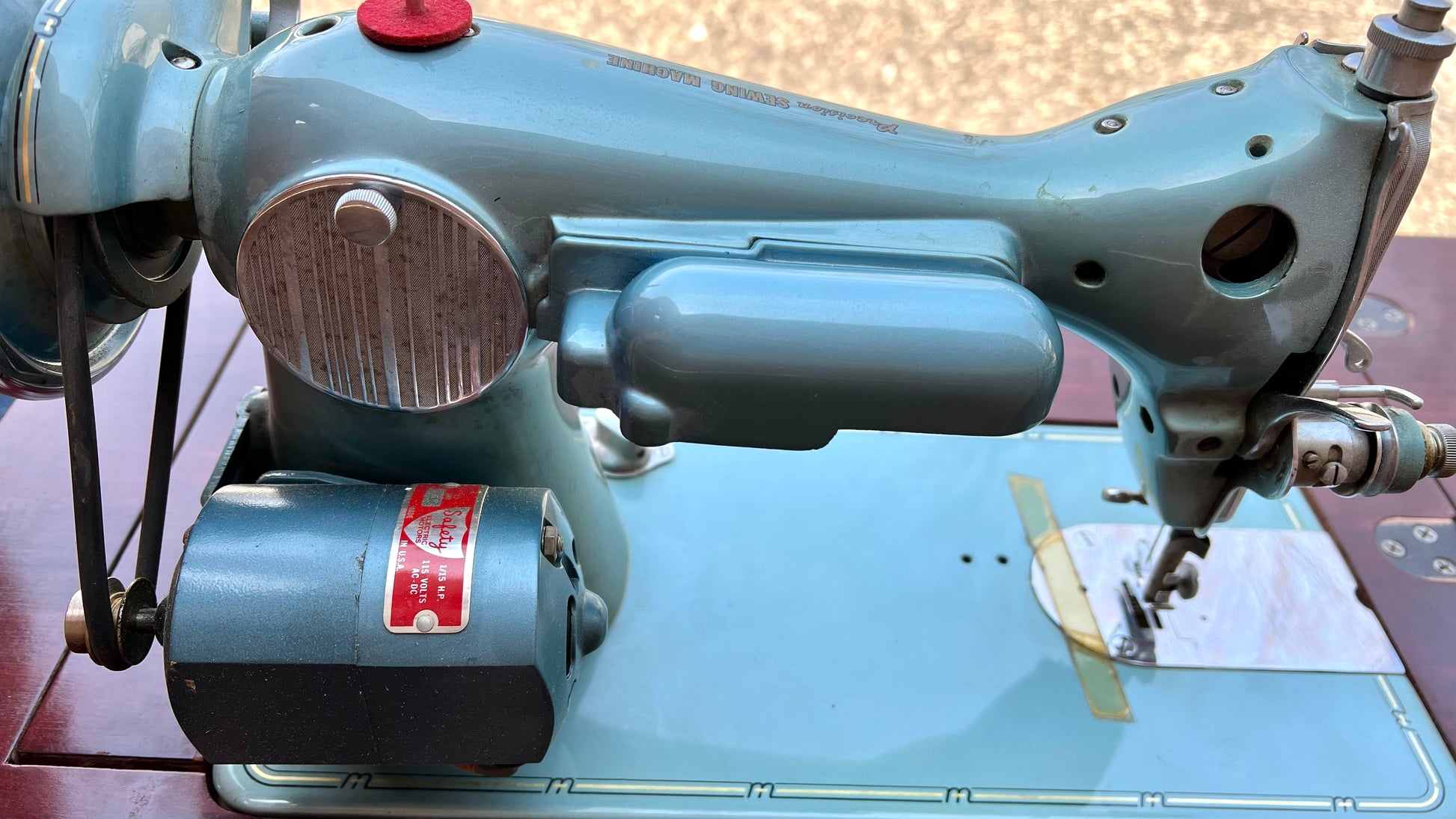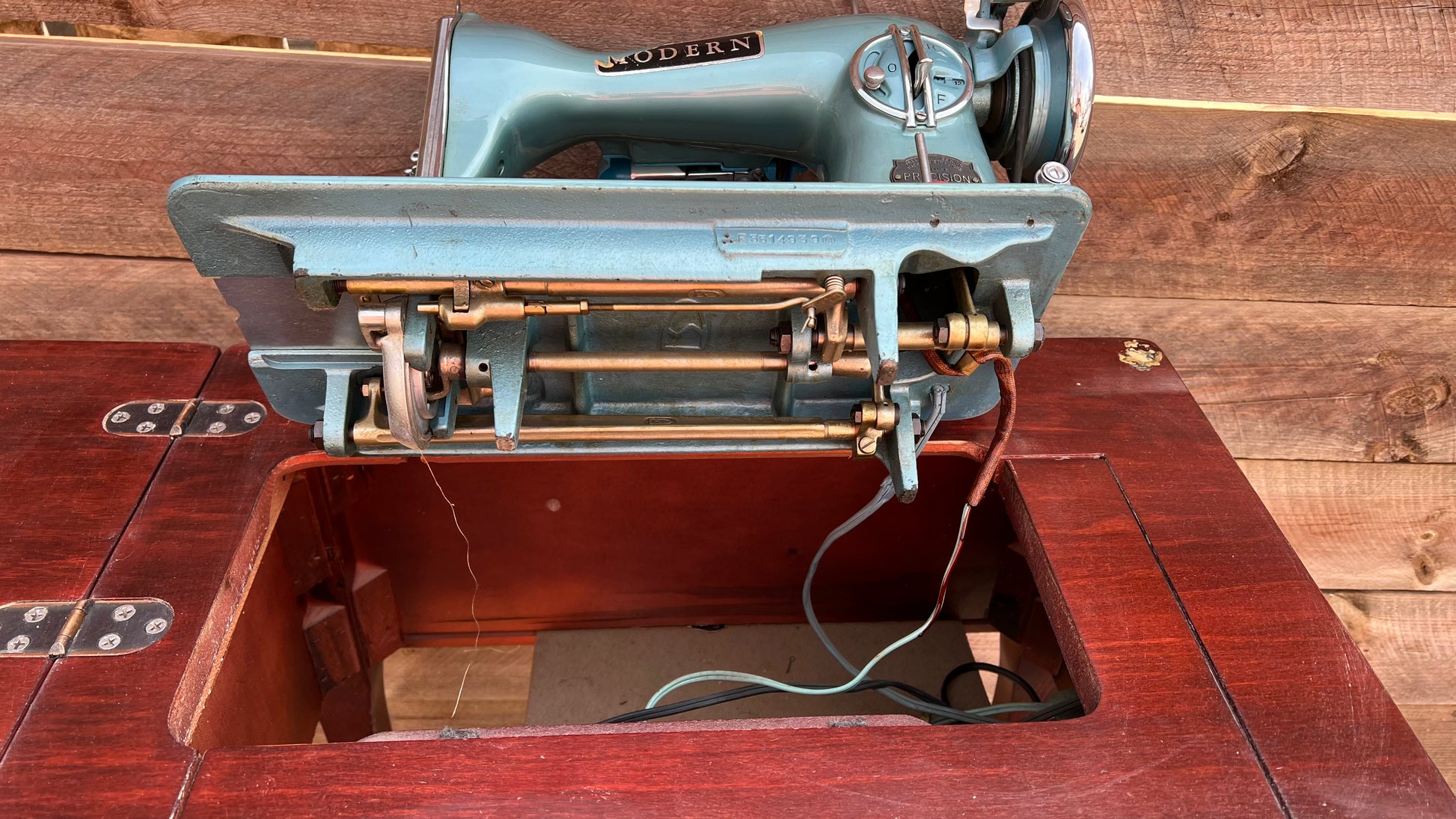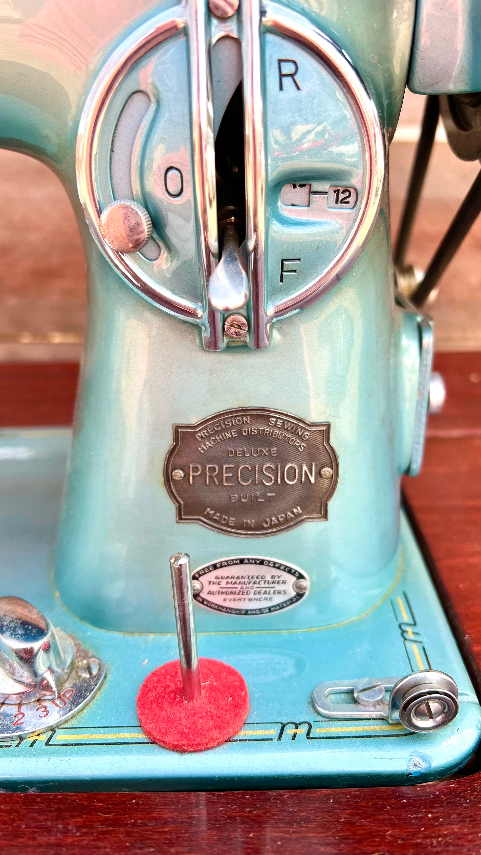 If a sewing machine can be pretty, this is the prettiest. From the sleek metallic finish, think 1956 Chevy, curves everywhere, pinstriping, and amazing chrome details, to the COLOR! The color alone makes this machine stand out. It's too bad that the "MODERN" sticker has come off a bit but the Precision metal emblem makes up for it, we hope. Don't worry about the yellowed tape across the sewing area, it was merely used to help keep a straight line while sewing, (I have an old address label on mine.)